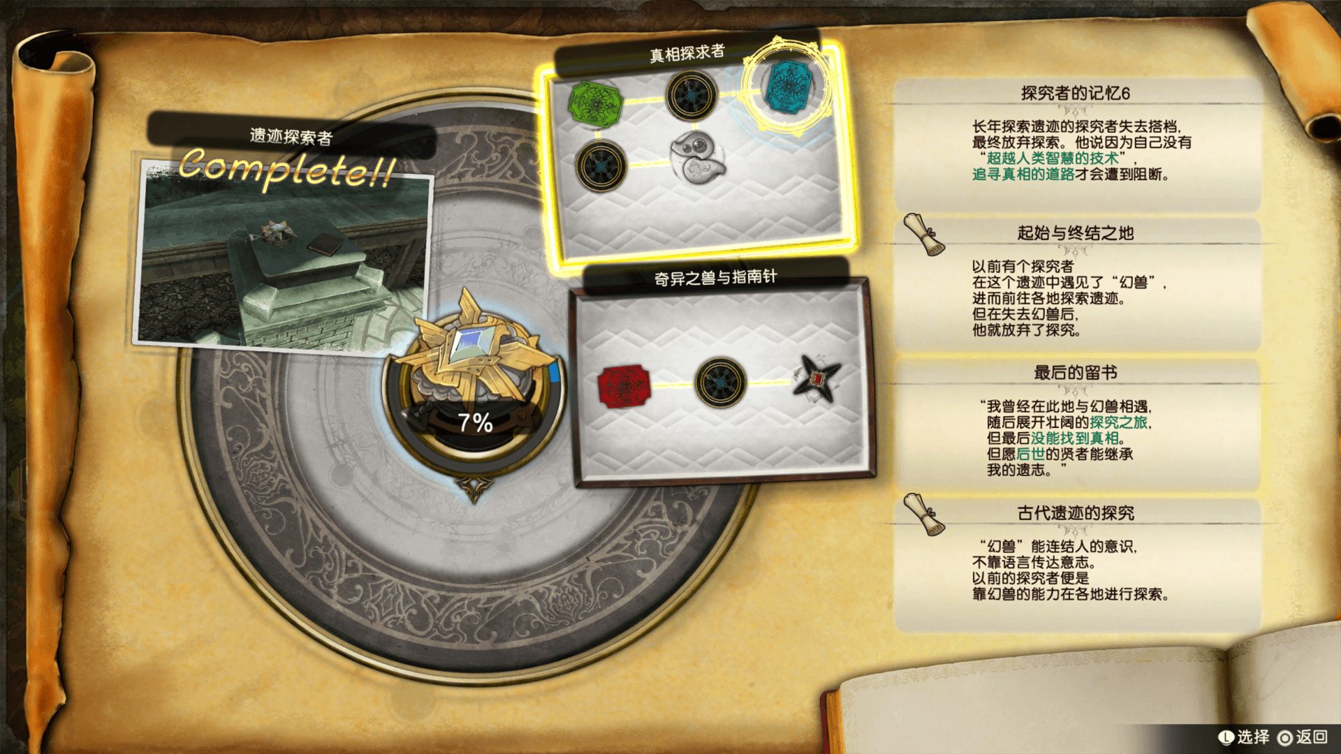 在遗迹找到魔物或宝物,查明调查一览的内容后,追忆的指南针就会逐渐活化。指南针活化后,会指出遗迹的碎片和记忆微粒所在方位。