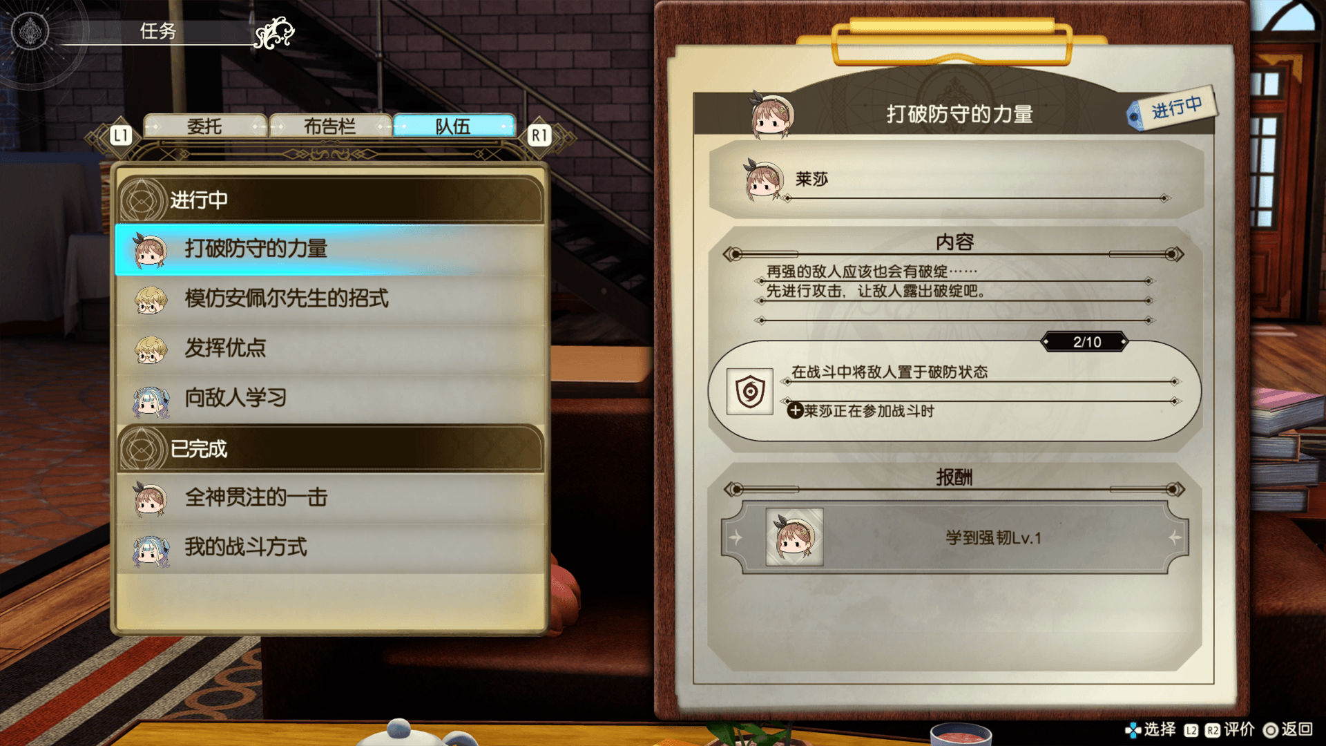 达成诸如调合或交付道具,或是讨伐魔物等任务目标时,即可推进游戏剧情或领取报酬。