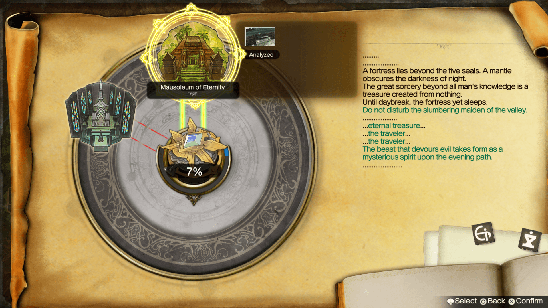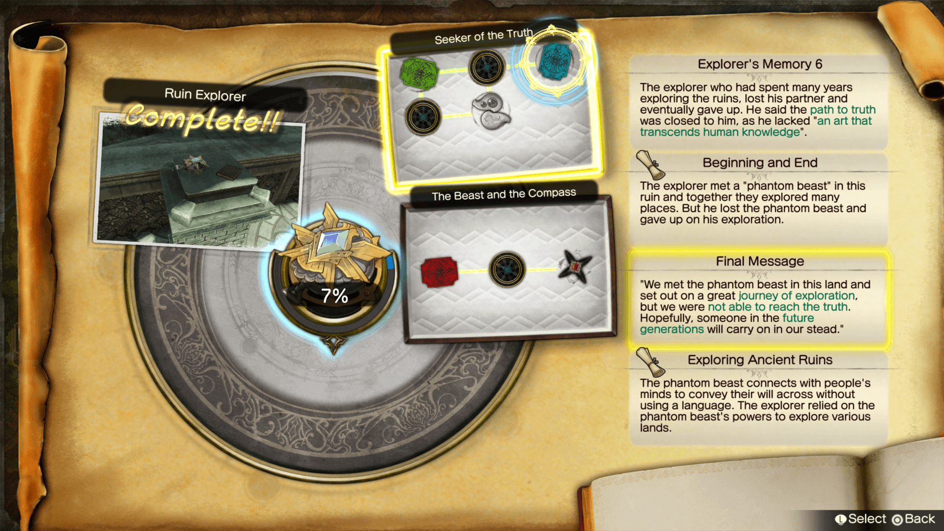This diary compiles the information you discover about ruins. New information you encounter on your investigations will all be recorded here.