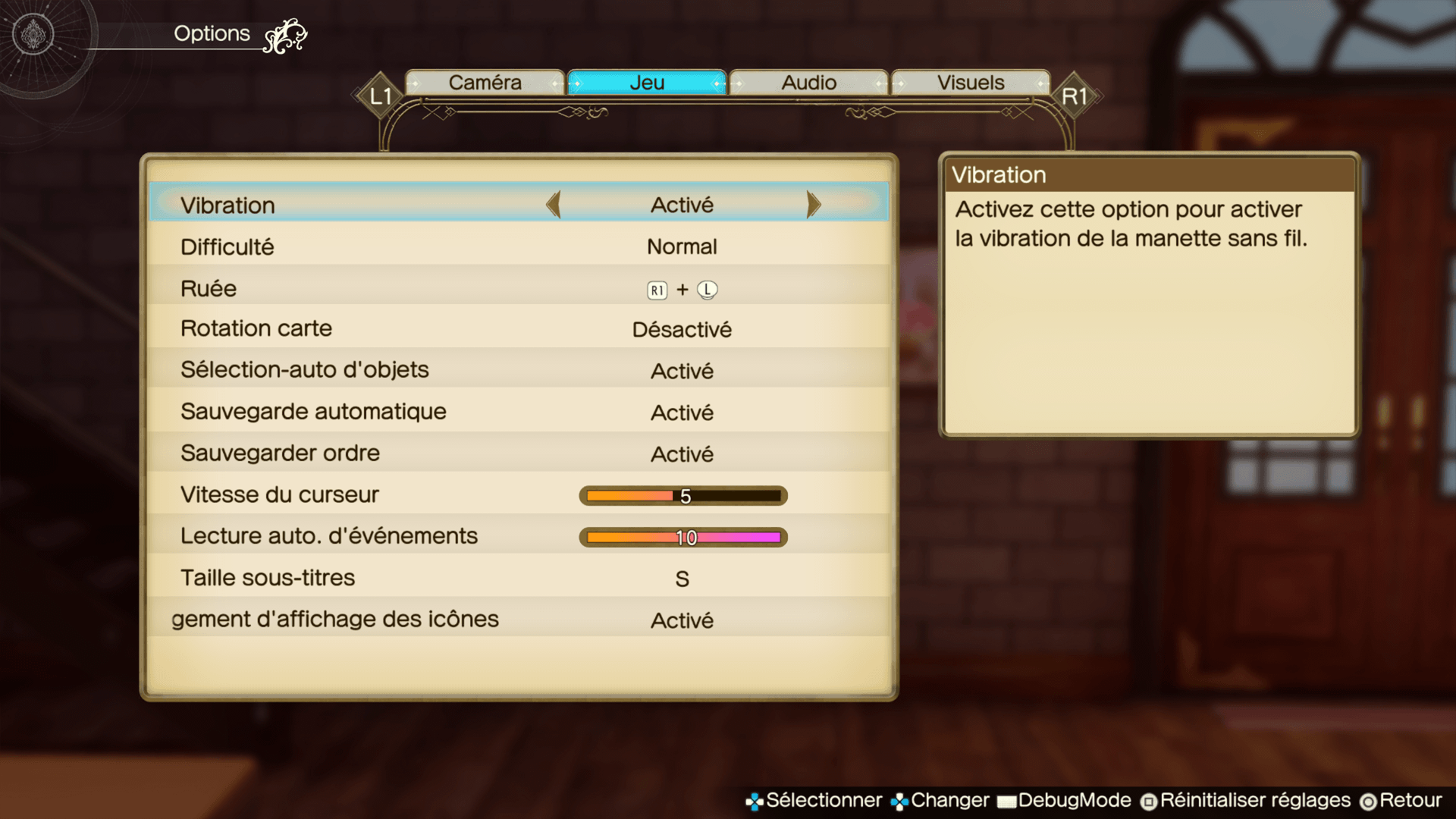 | Lecture auto. d'événements | Modifie la vitesse de la lecture automatique des textes durant les scènes cinématiques. |
