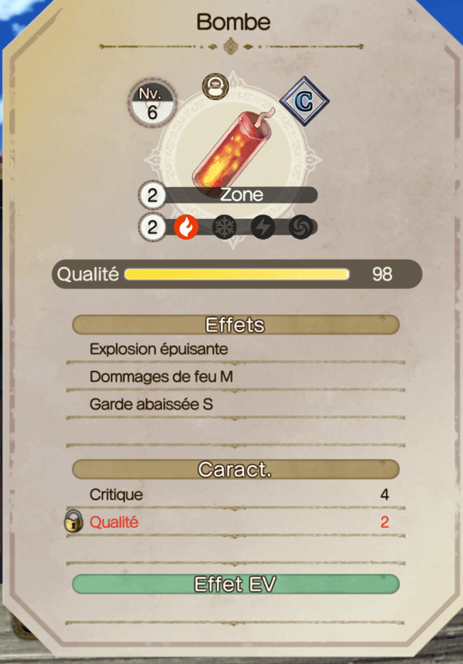 | Retenue | empêche d'enchaîner des compétences. Utilisé sur les ennemis, augmente le délai nécessaire pour qu'ils lancent une attaque puissante. À niveau élevé, diminue la résistance au vent. |