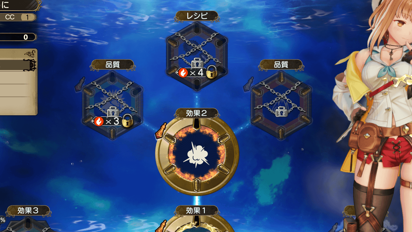 調合はアトリエの錬金釜で行います。調合には、アイテムのレシピが必要です。