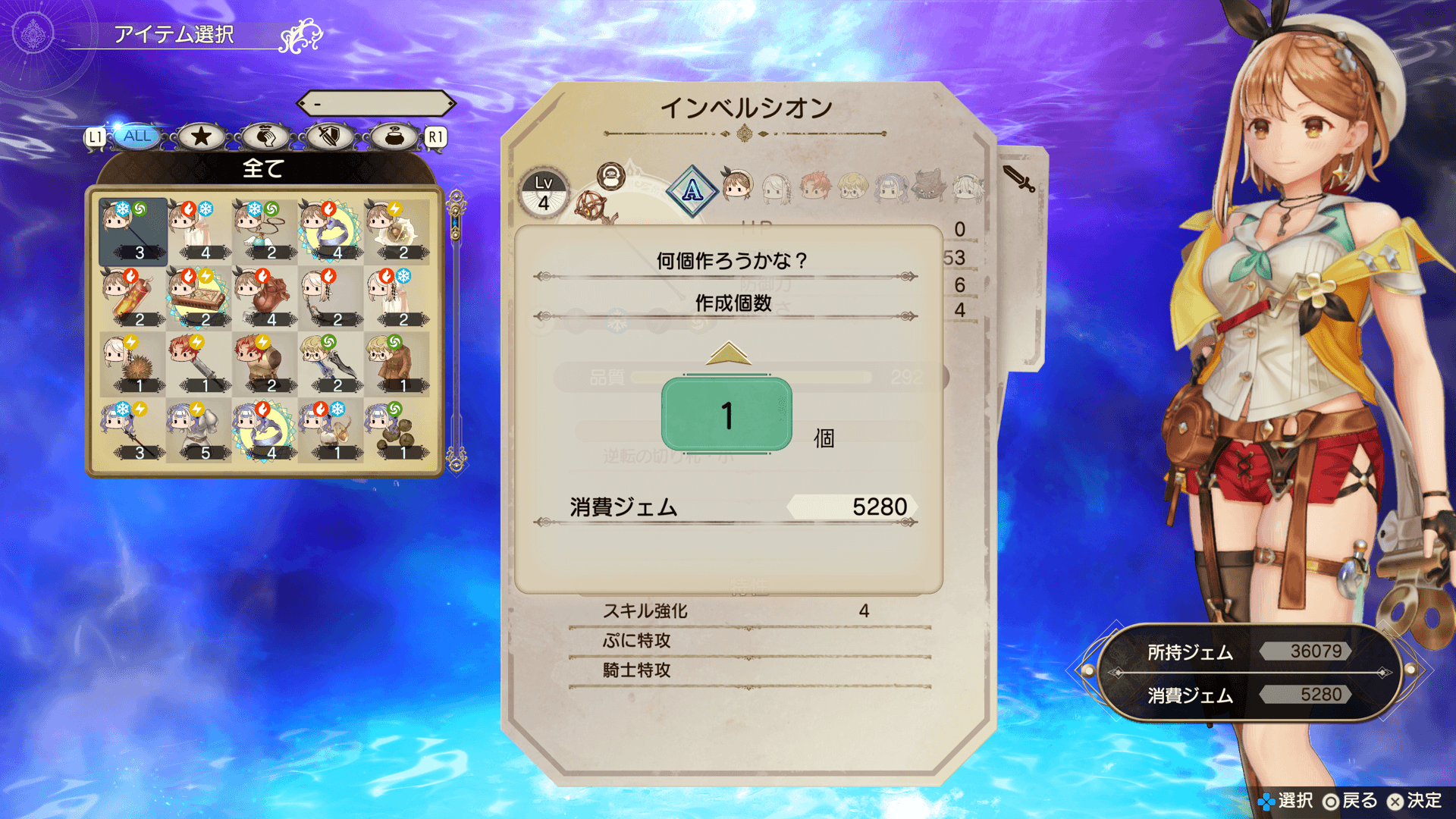 複製釜で「アイテム複製」を選びます。複製するアイテムと数を決め、ジェムを投入します。複製するアイテムや数によって、消費するジェムの量が変わります。