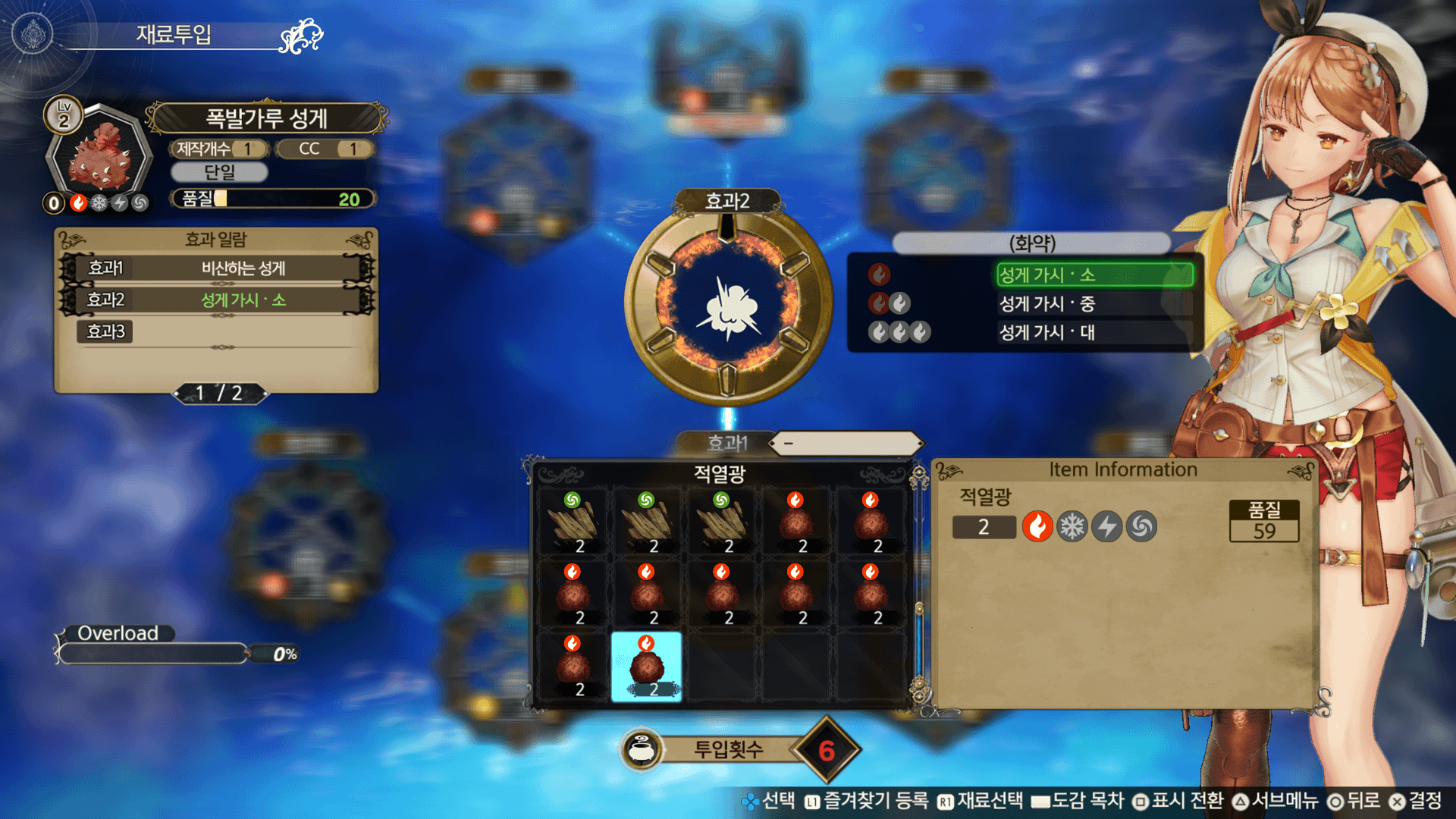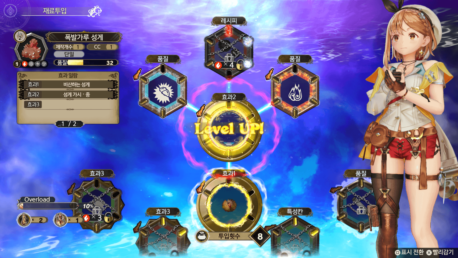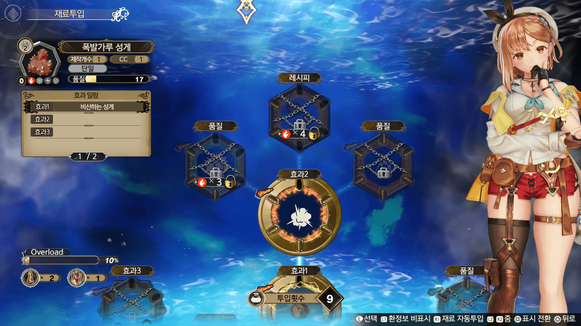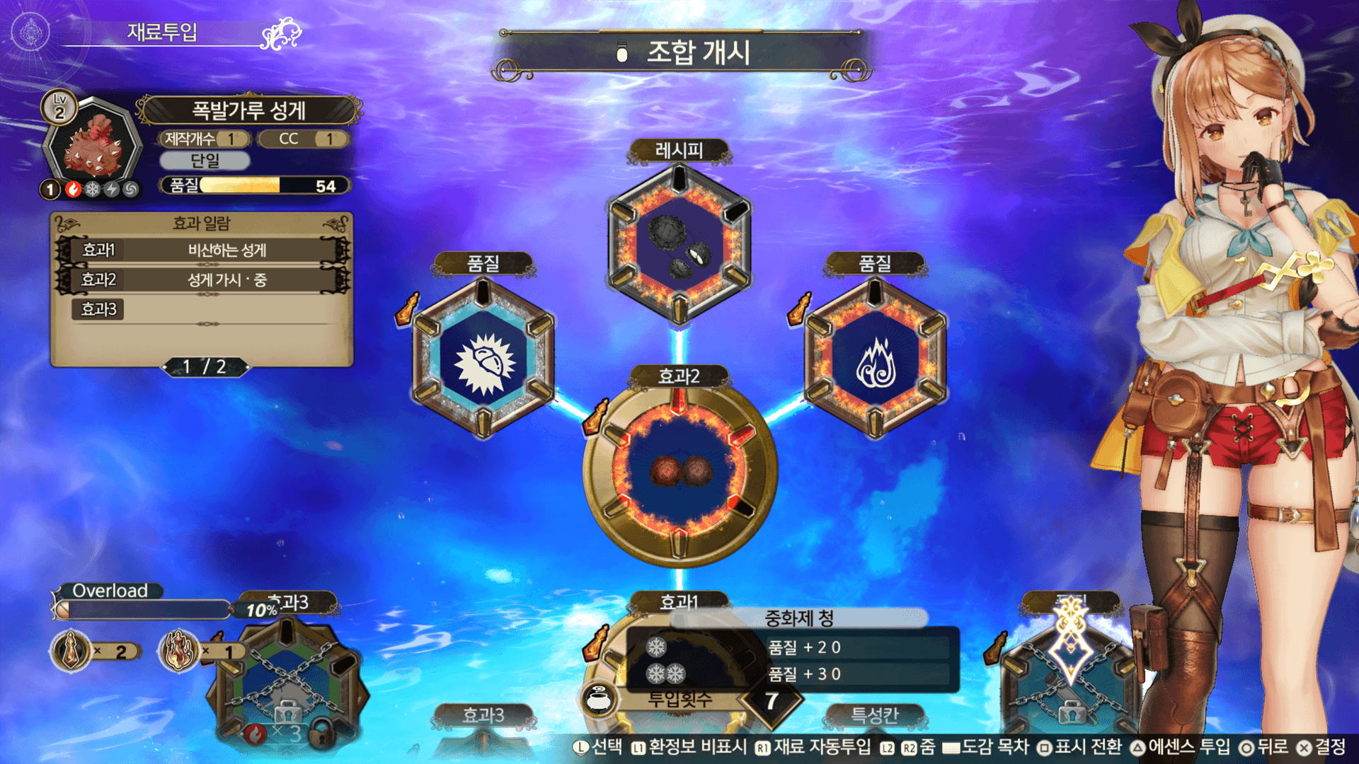 조합은 아틀리에의 연금가마에서 할 수 있습니다. 조합을 하기 위해서는 아이템의 레시피가 필요합니다.