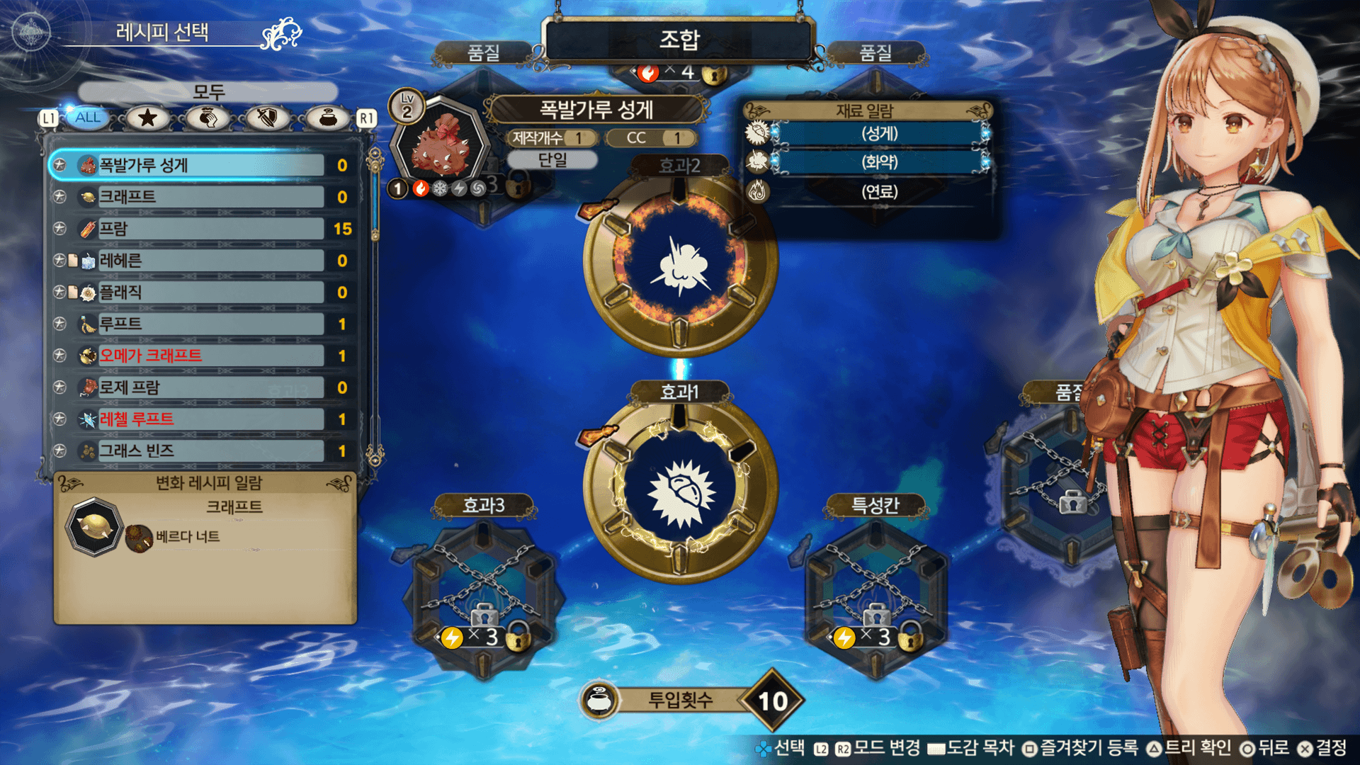 연금가마의「조합」에서 제작할 아이템을 선택합니다. 아이템 제작 가능 여부에 대해서는 레시피명의 글자색으로 확인할 수 있습니다.