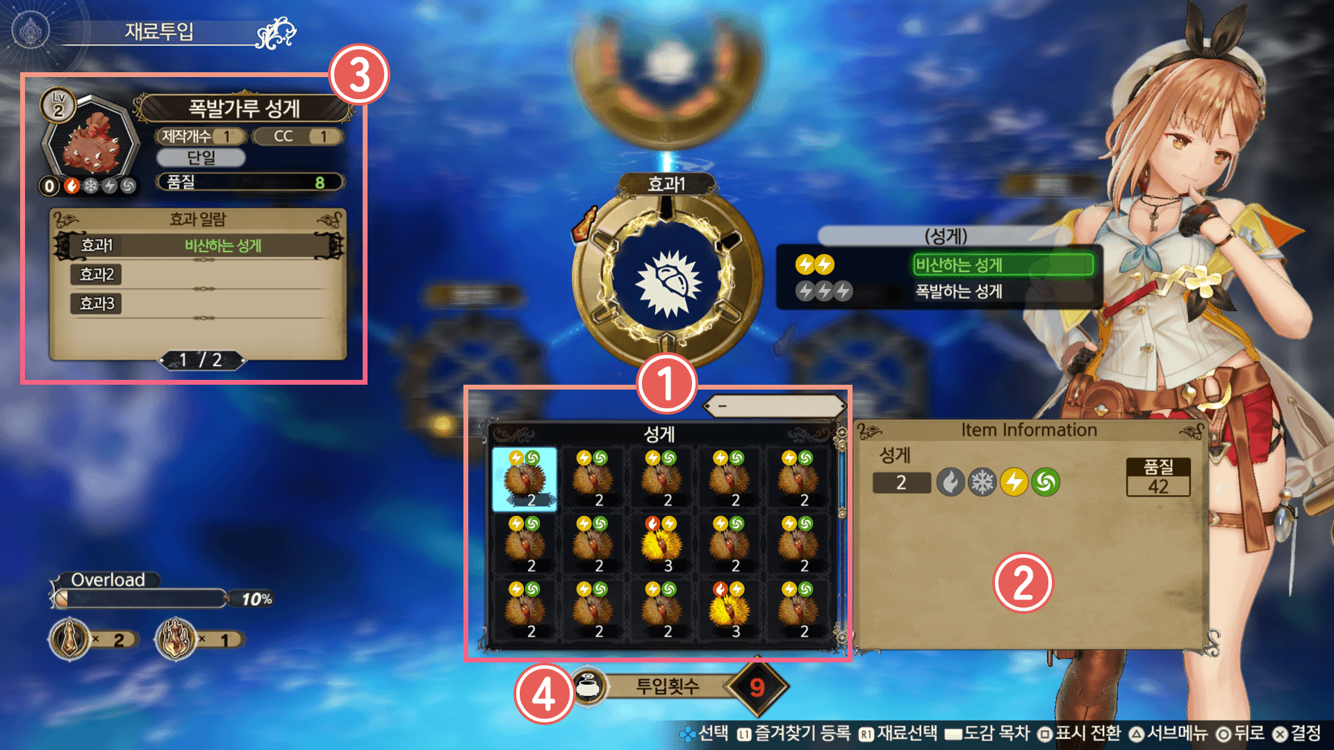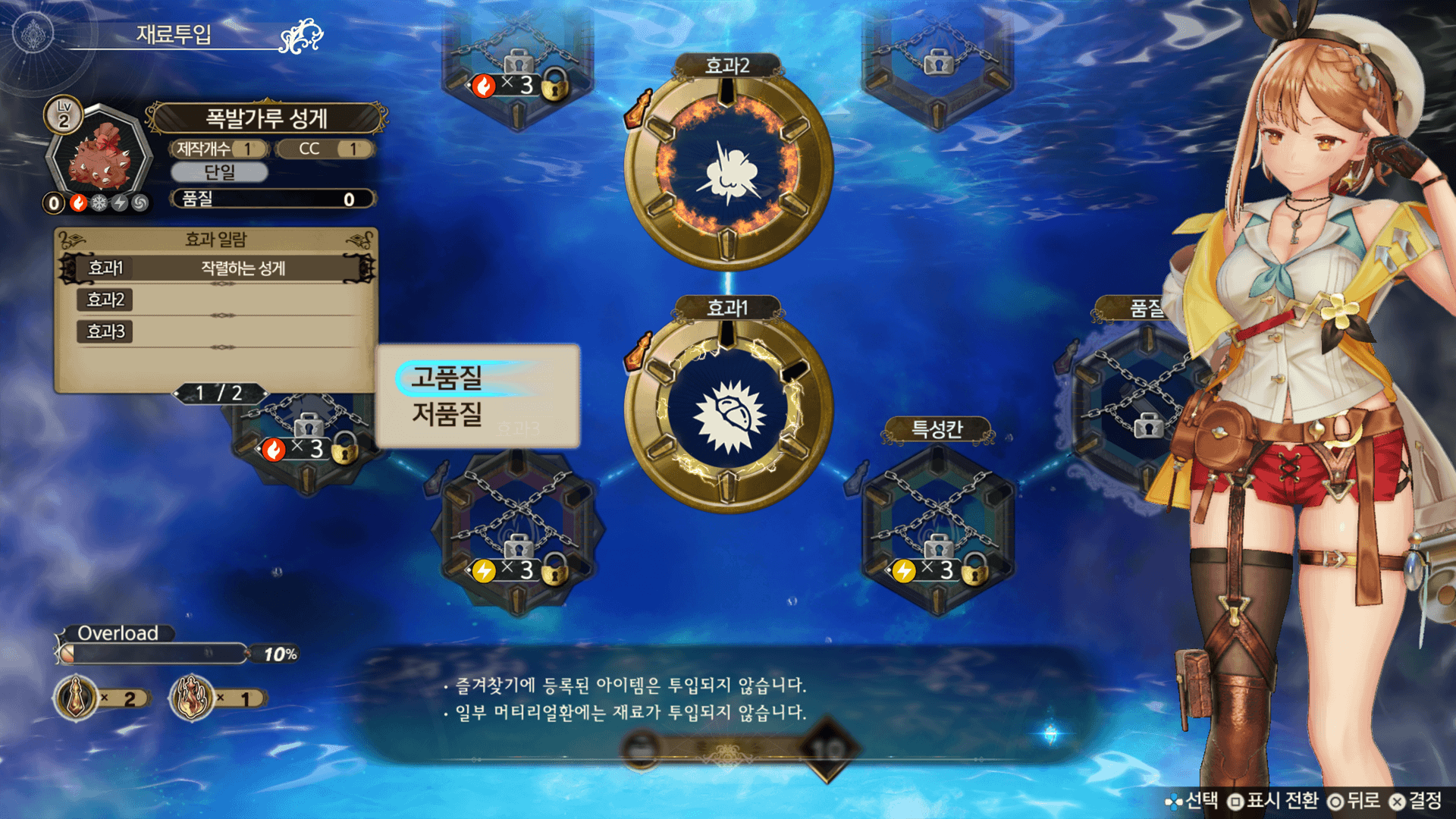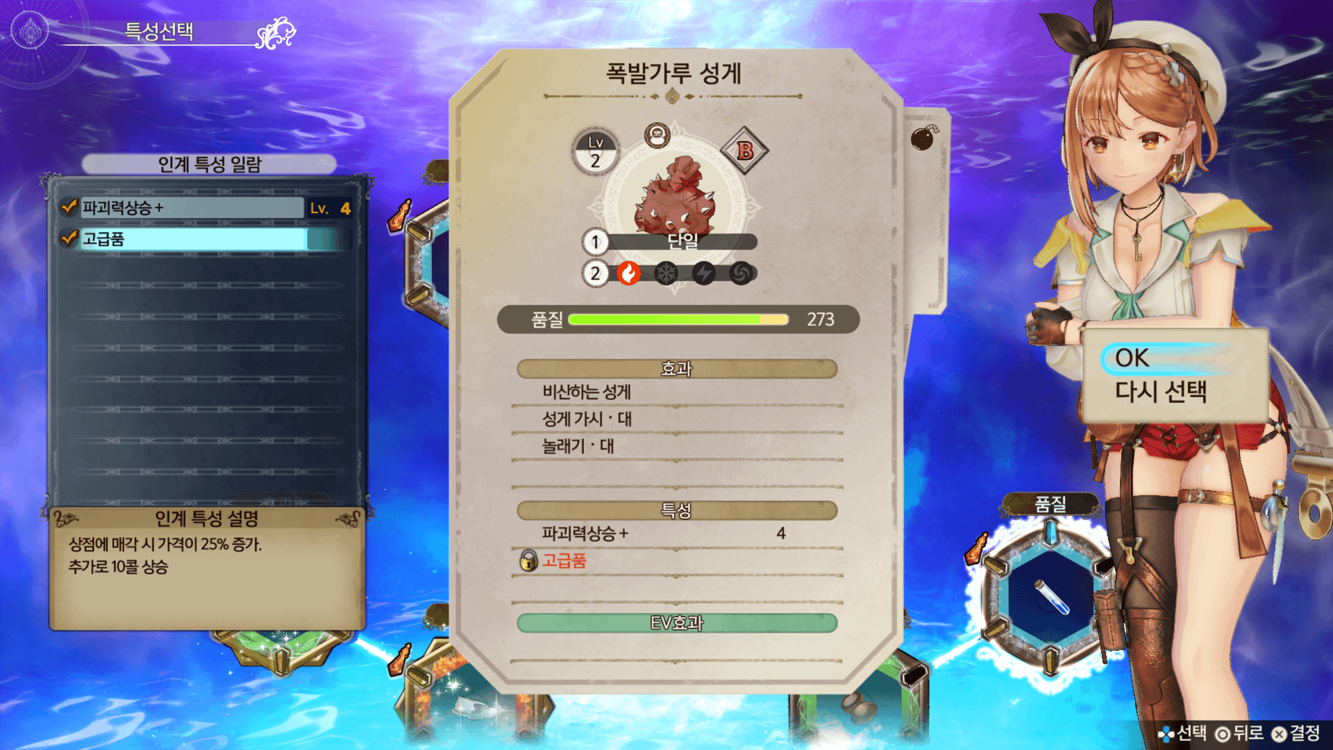 선택 중인 재료의 속성과 효과, 특성입니다. 아이템의 품질을 높이거나 특성을 인계할 수 있습니다.