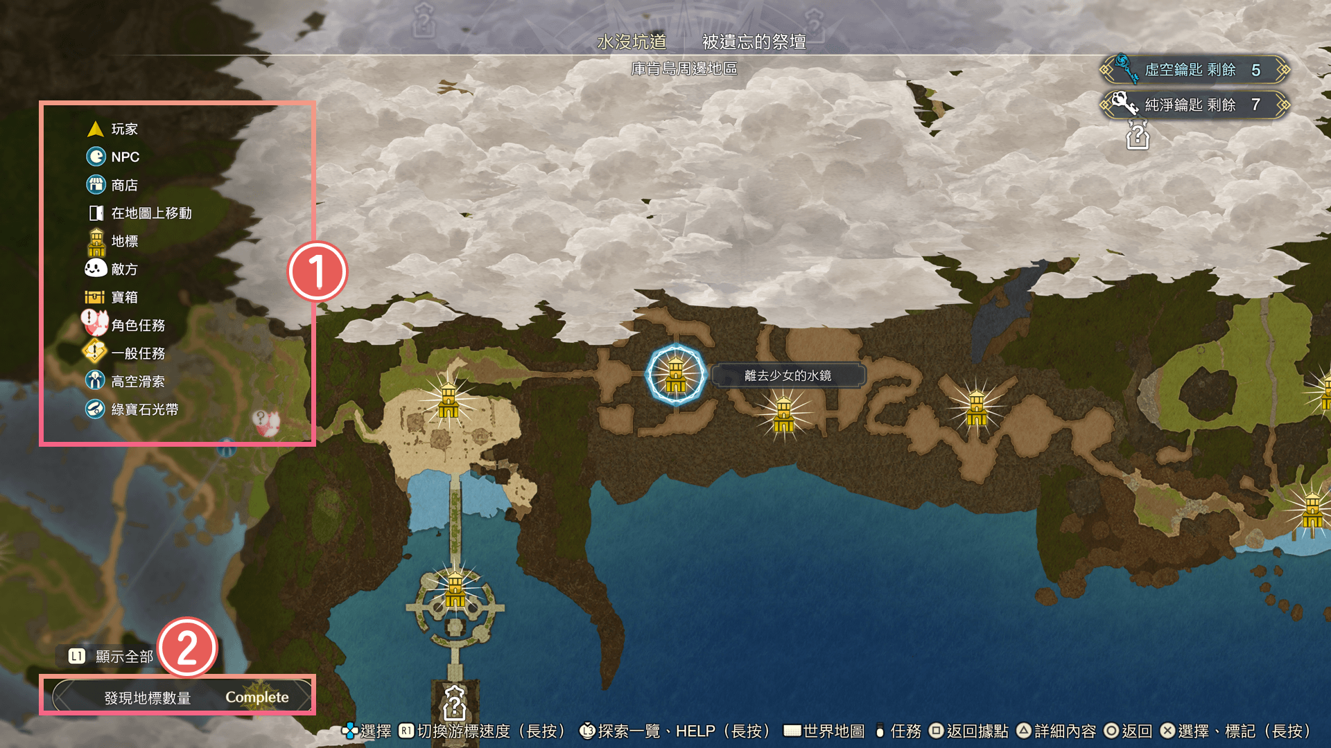 當區域內的所有地標皆被發現後,會顯示「Complete」字樣。