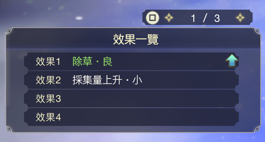 以割草鐮刀為例,其效果將依「除草」→「除草‧良」→「除草‧優」的順序提升。