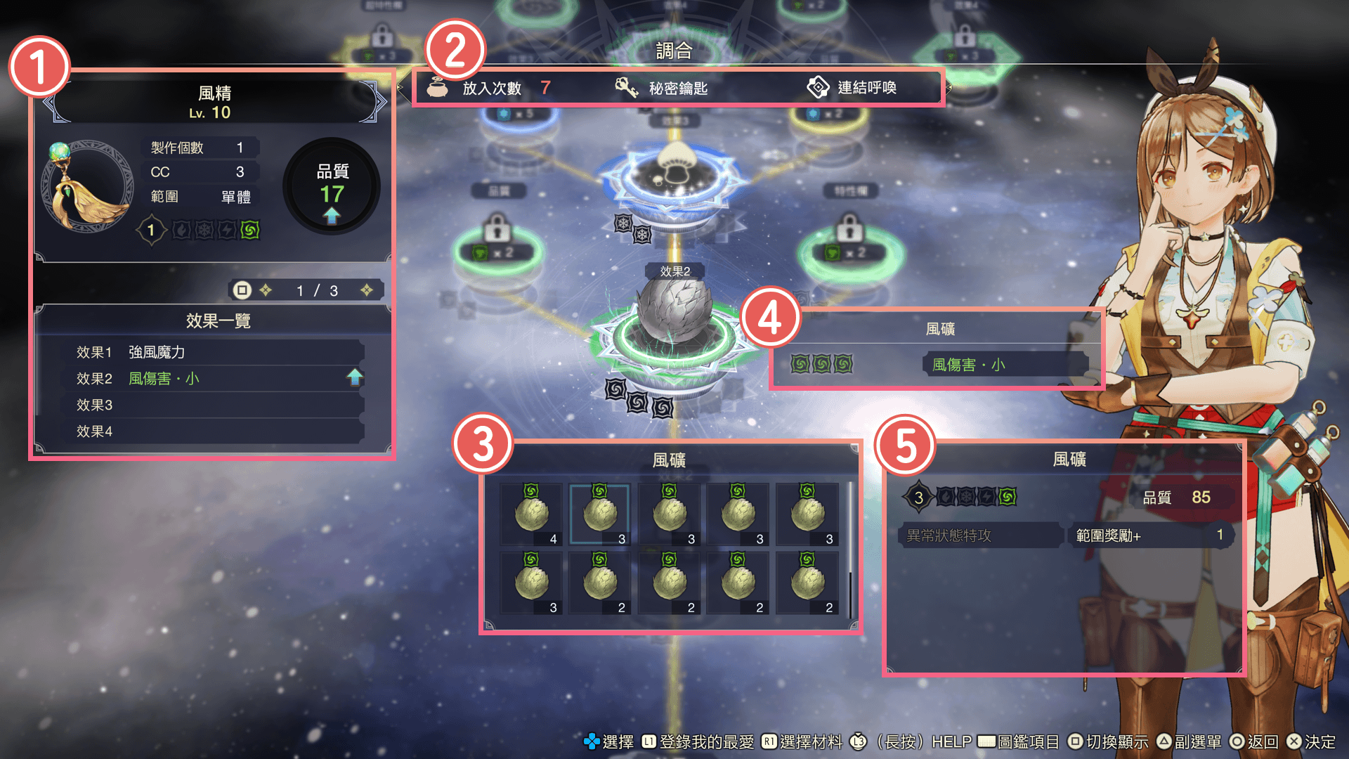 可以放入材料的次數。在所有的基礎材料環放入材料後,會顯示秘密鑰匙、連結呼喚的按鈕或按鍵圖示。