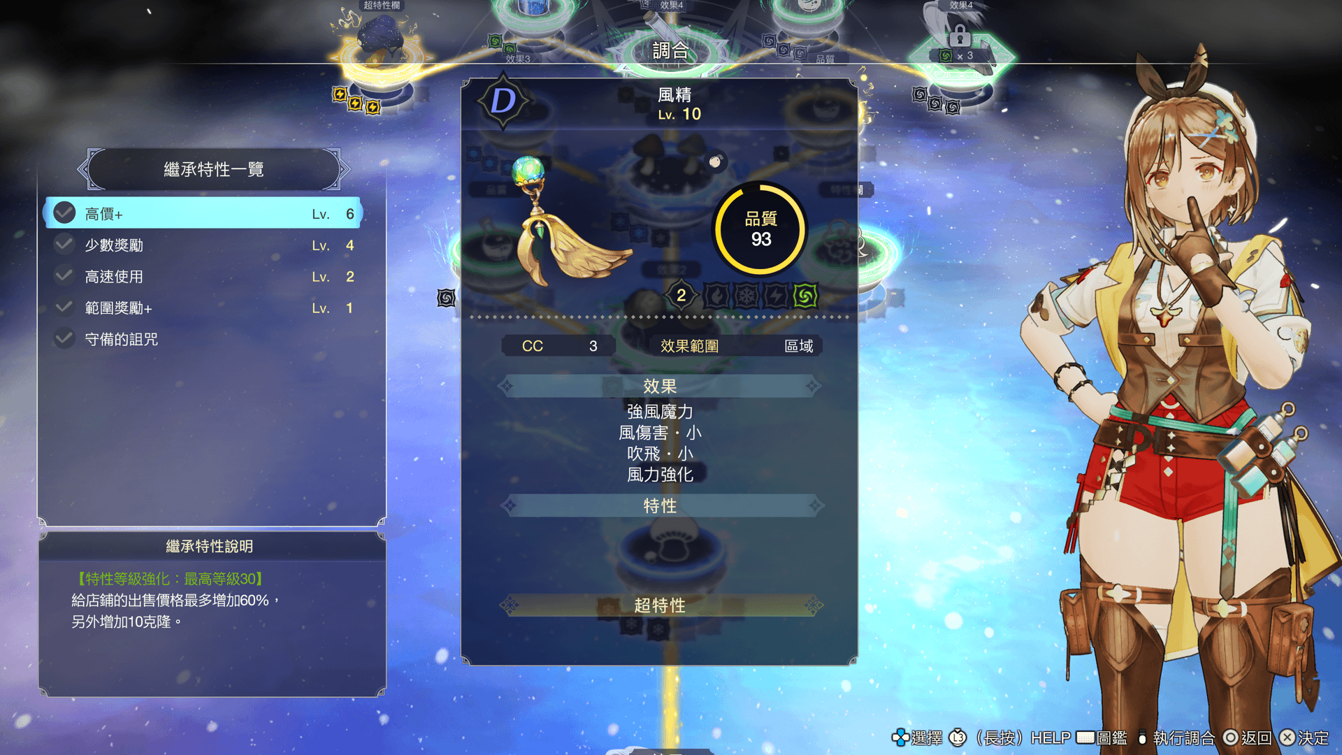 於調合時,如果讓「超特性欄」的材料環升級,便可將一個超特性繼承至道具。