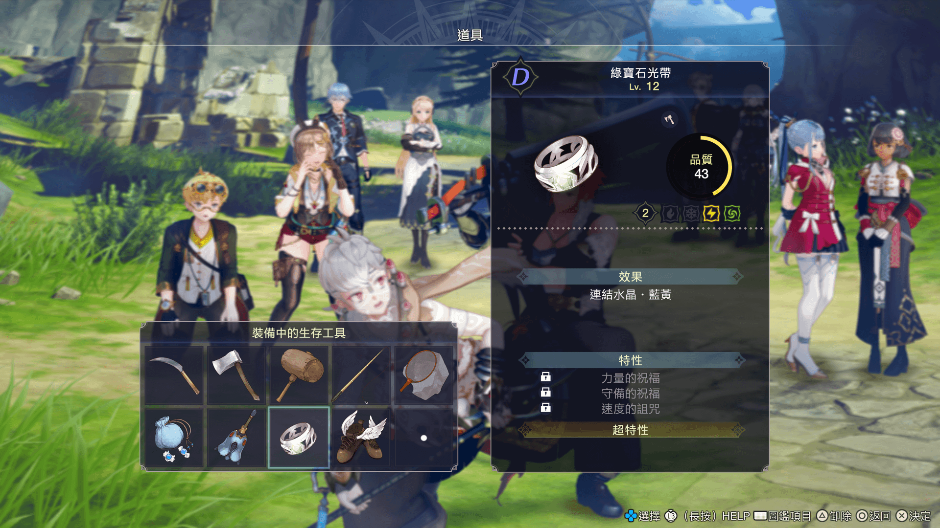 製作出的採集道具與冒險道具可以從主選單的「道具」進行裝備,之後便可在原野使用。