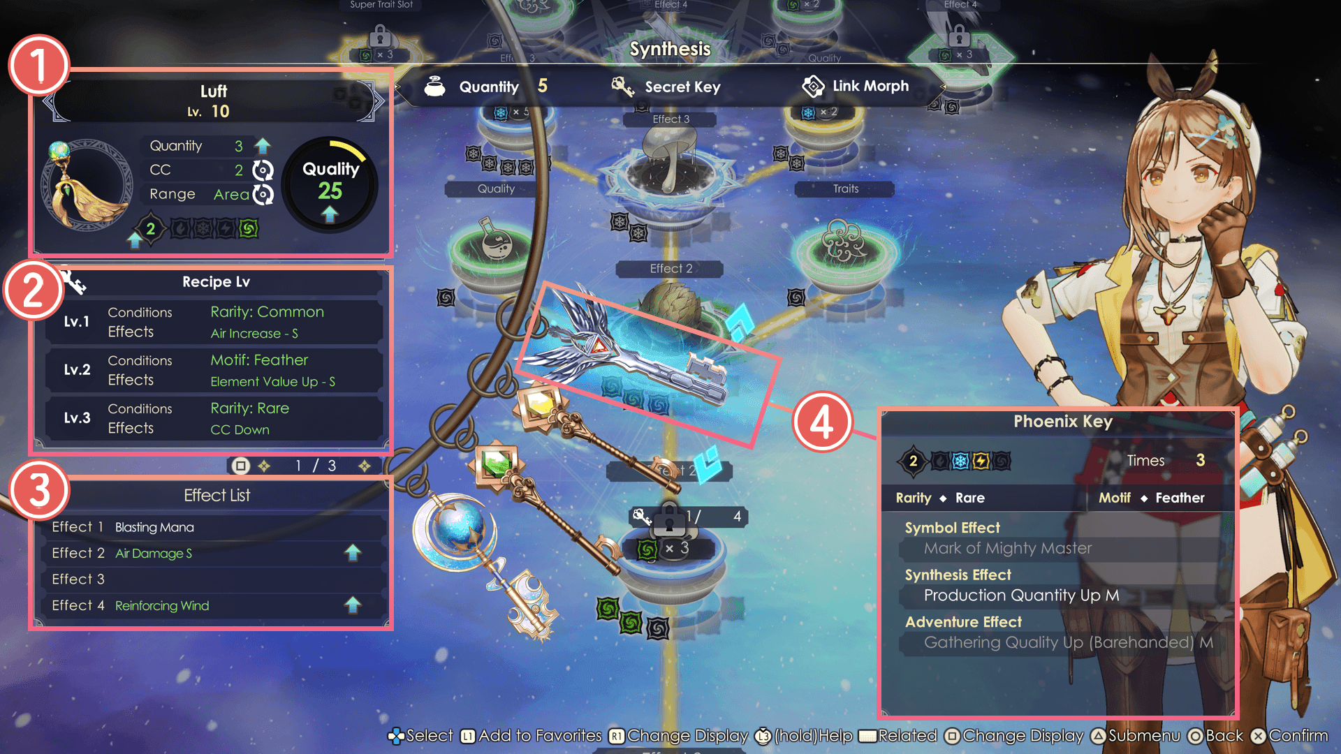 As you progress through the story, you will learn to use Secret Keys during synthesis to apply various effects to items.
