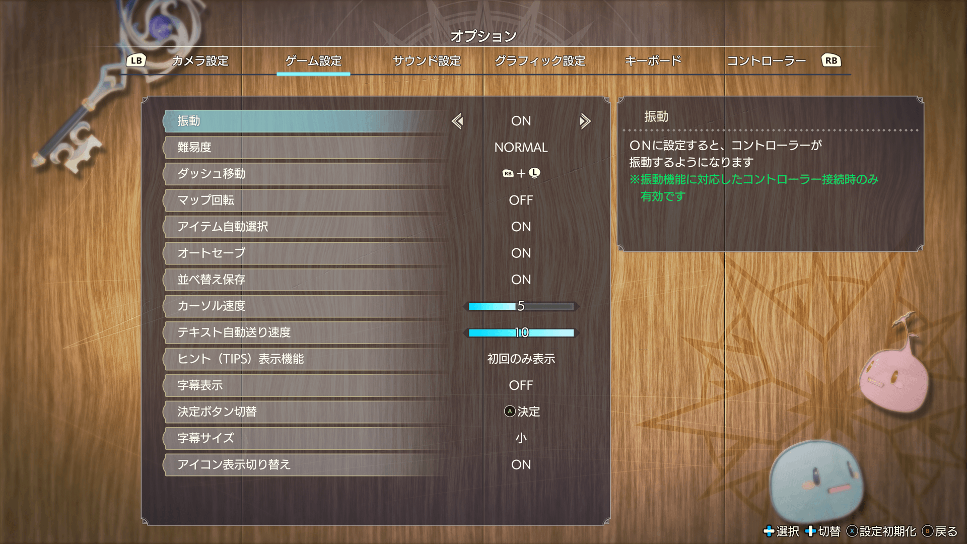 | 振動 | ONにすると、コントローラーが振動します。 振動機能に対応したコントローラー接続時のみ有効です。 |