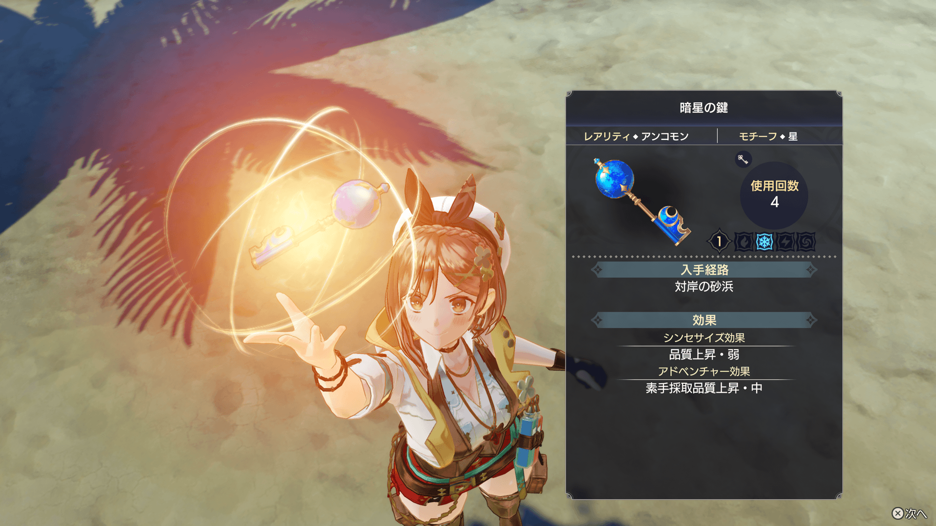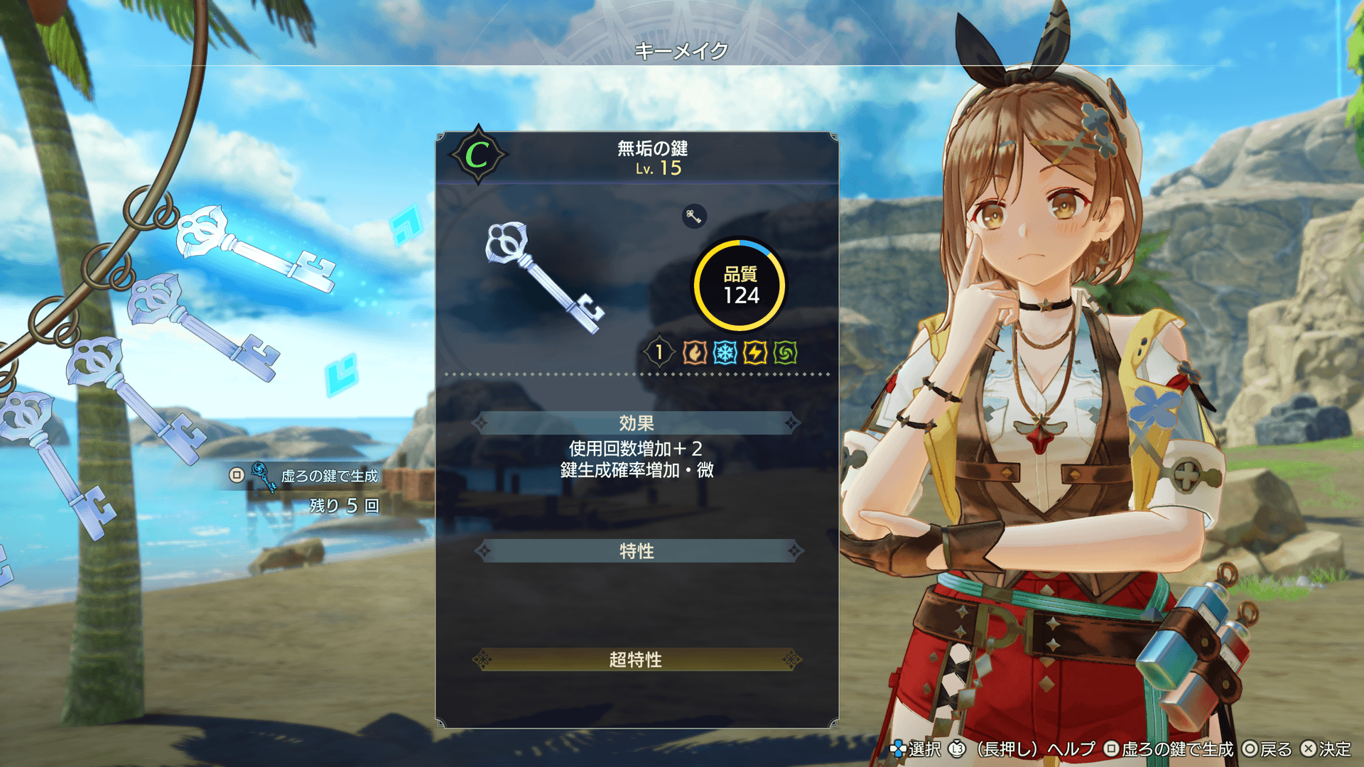 調合時に「秘密の鍵」を使用すると、材料投入回数を増やしたり、完成アイテムにさまざまな効果を付与したりできます。