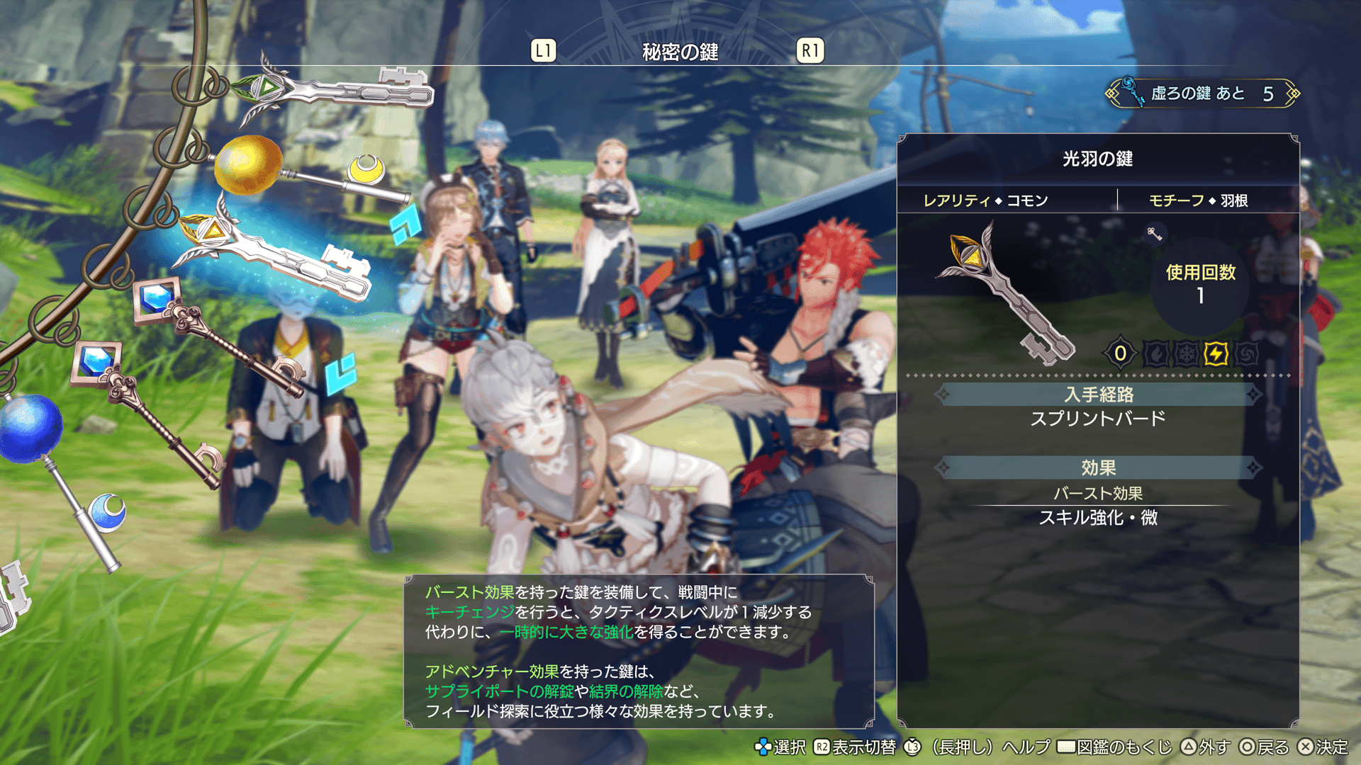 メインメニューの「戦闘準備」の「装備」で、各キャラクターに秘密の鍵を1本装備できます。