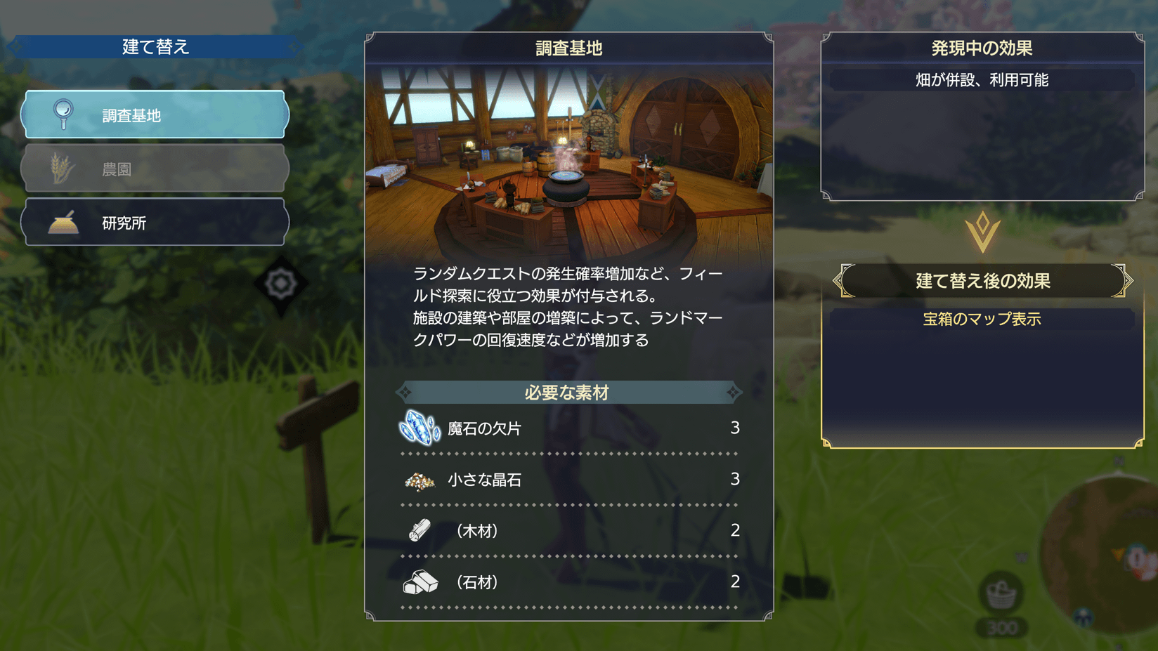 | 農園 | 畑の利用が可能になります。採取できる素材の品質・特性が上昇します。 | 畑の収穫物の品質や収穫量が上昇します。採取できる素材の品質・特性がさらに上昇します。 |