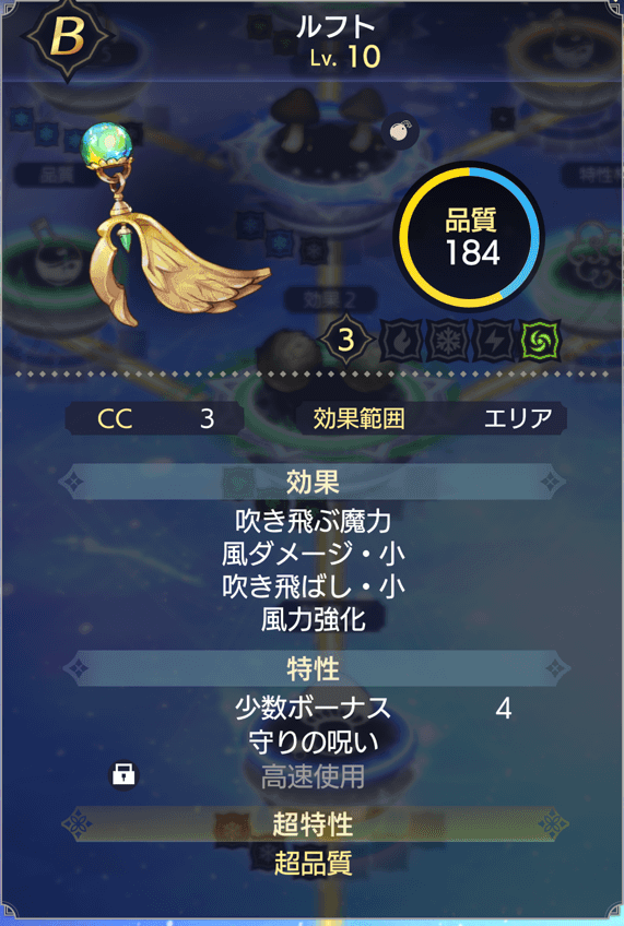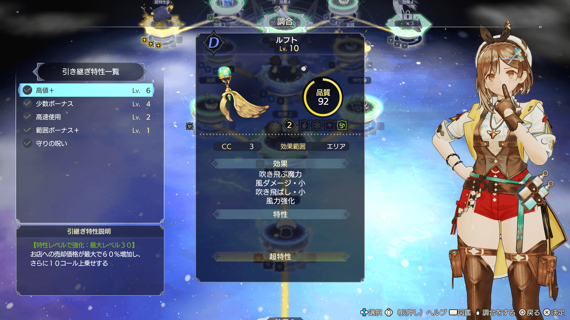 調合中、「超特性枠」のマテリアル環をレベルアップさせると、超特性を1つだけアイテムに引き継げます。