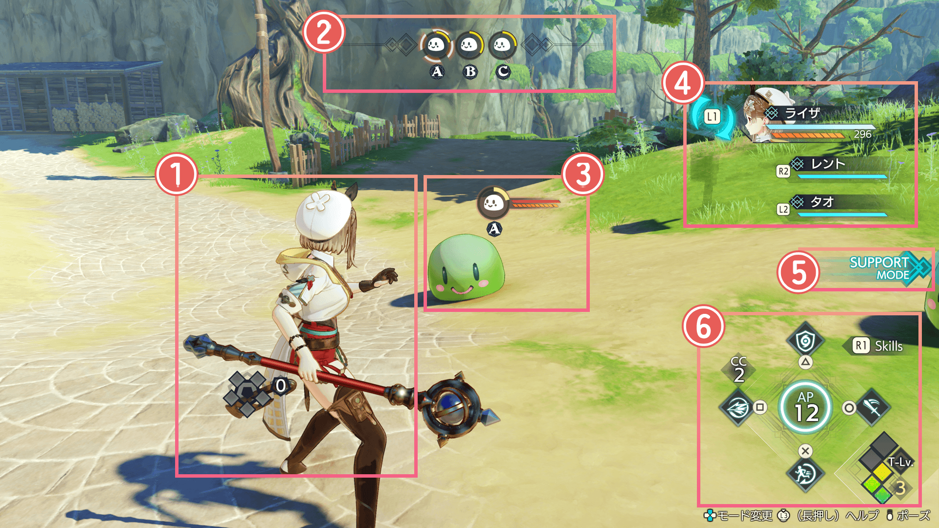 円形のゲージは操作キャラクターのWait Timeゲージです。時間経過で増加し、いっぱいになると行動できます。