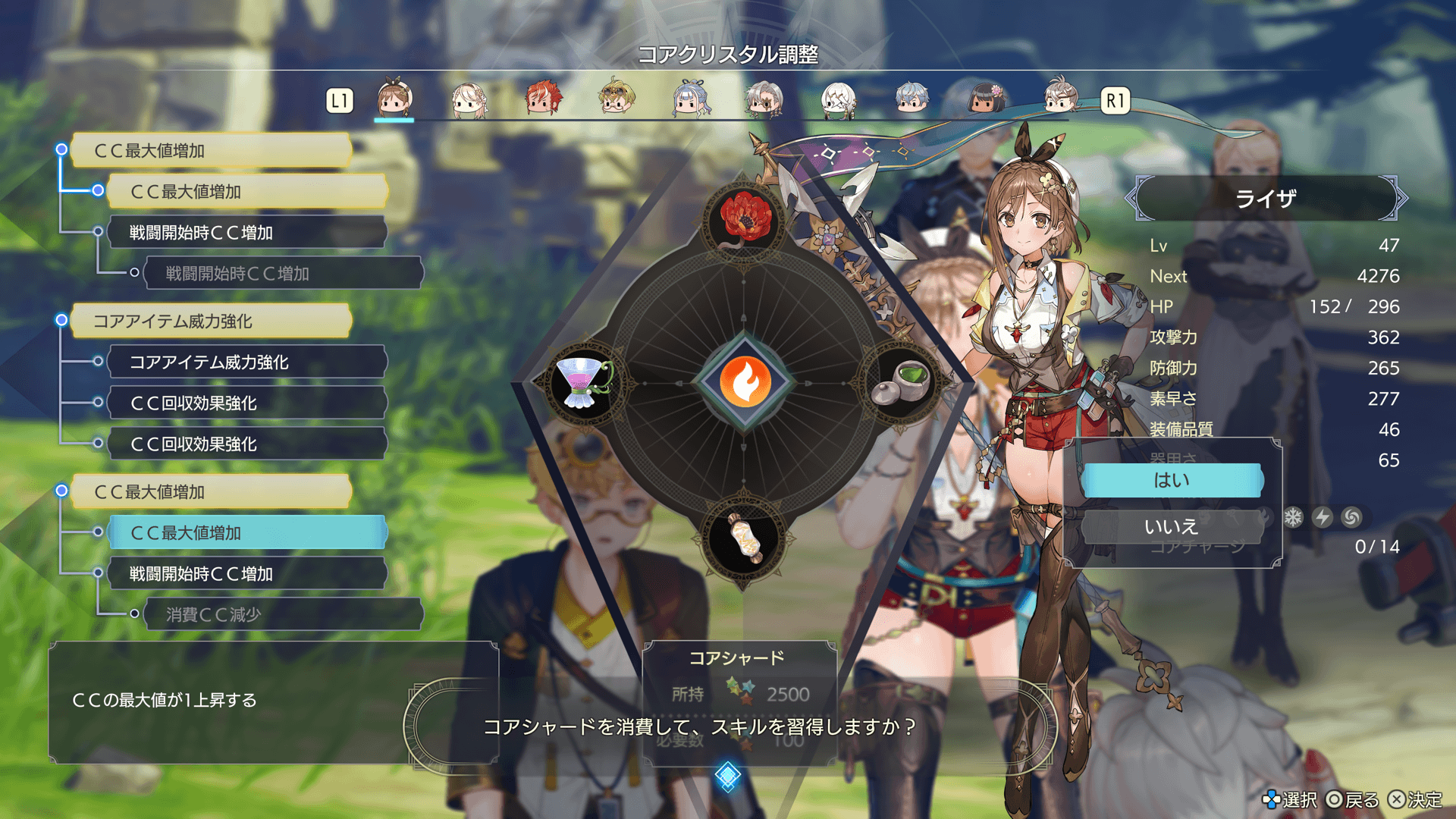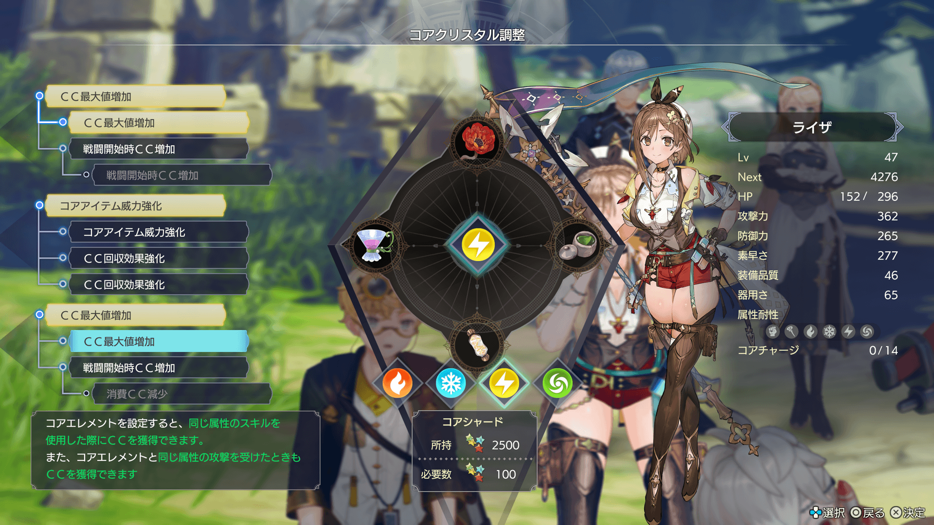 キャラクターごとにコアクリスタルを持っています。コアエレメント(属性)を変更したり、コアクリスタルを強化したりすることで、戦闘に様々な影響があります。