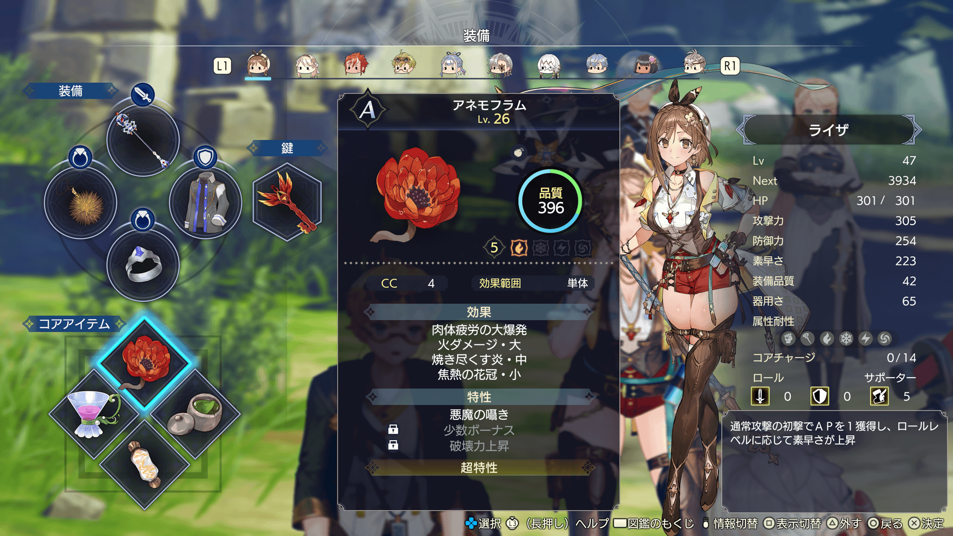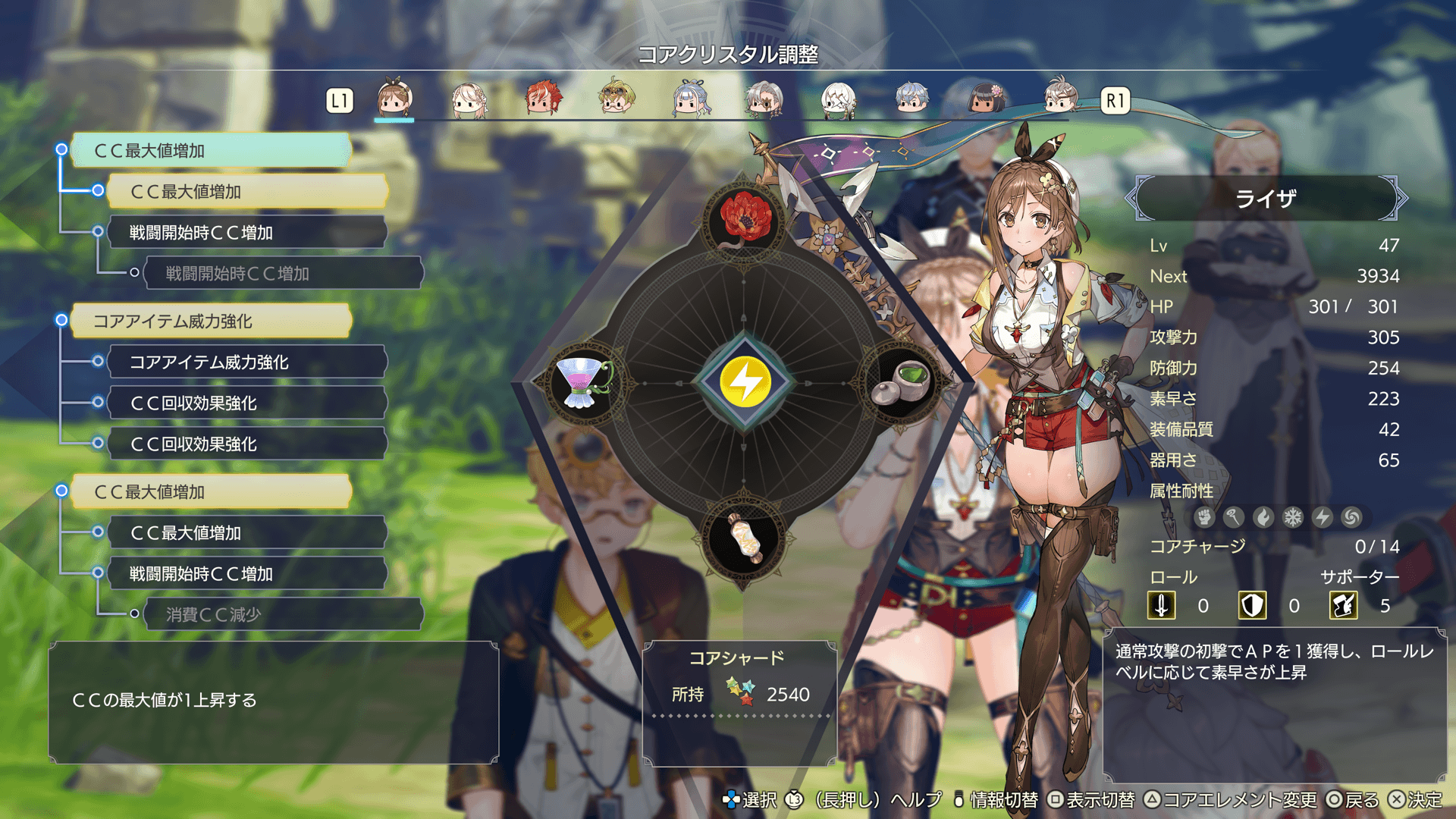 キャラクターごとに、コアエレメントを設定できます。戦闘中、コアエレメントと同じ属性のスキルや攻撃アイテムが強化され、通常より多くCCを獲得します。