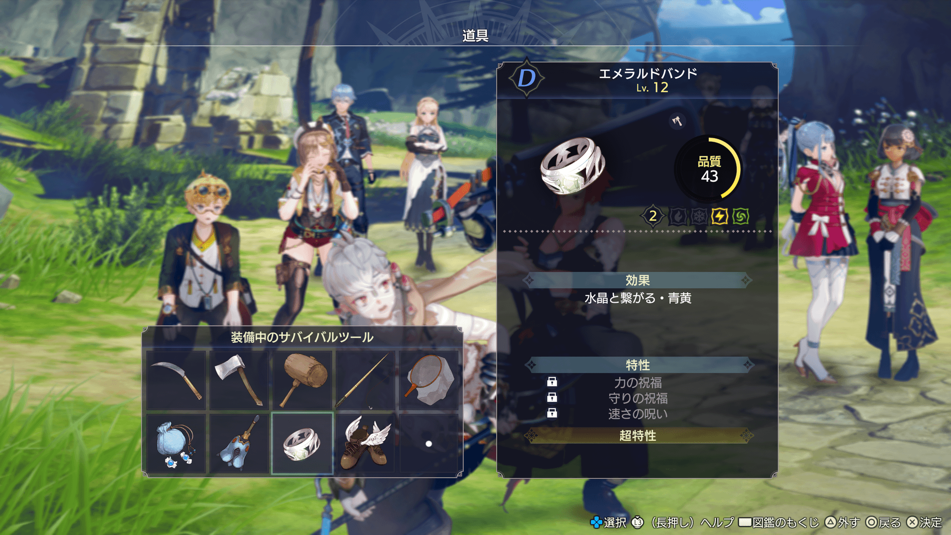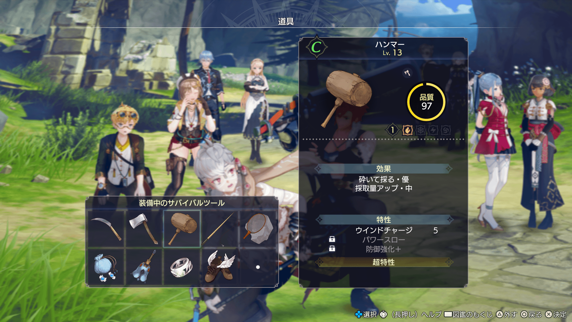 作成した採取道具と冒険具は、メインメニューの「道具」で装備すると、フィールドで使えるようになります。
