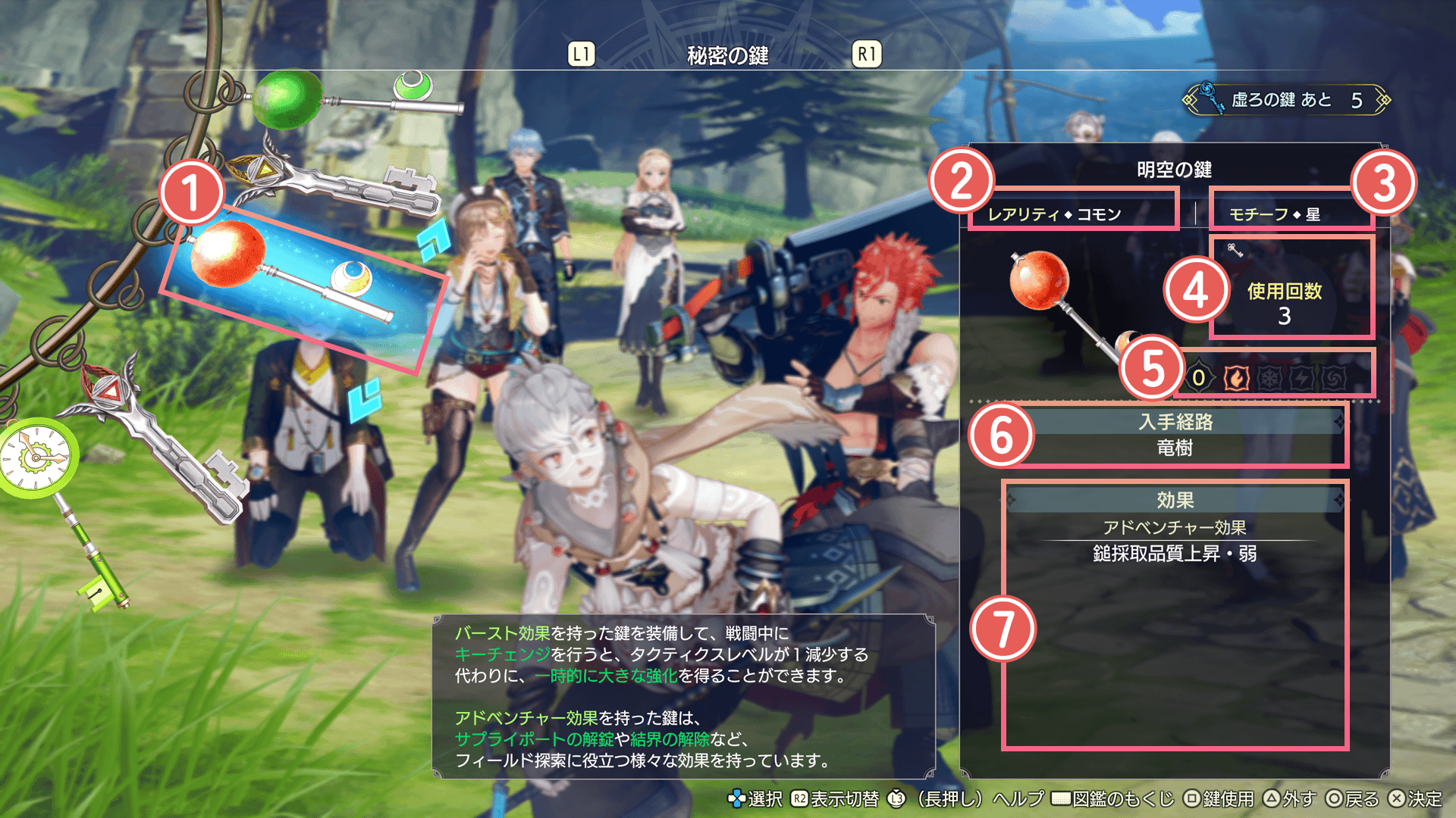 鍵束には秘密の鍵を10本までセットできます。バースト効果、アドベンチャー効果は鍵束にセットしないと発動できません。