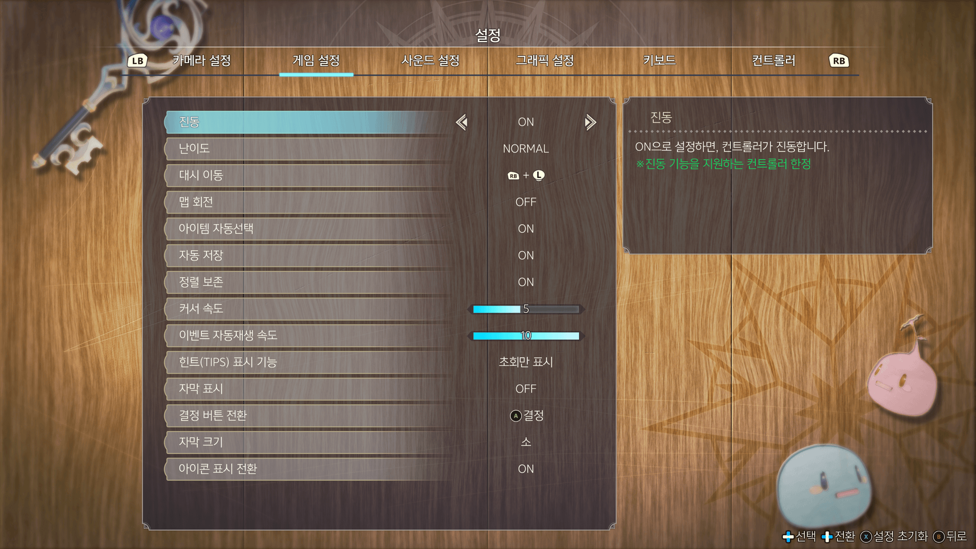 | 진동 | ON으로 설정하면, 컨트롤러가 진동합니다. 진동 기능을 지원하는 컨트롤러 한정 |