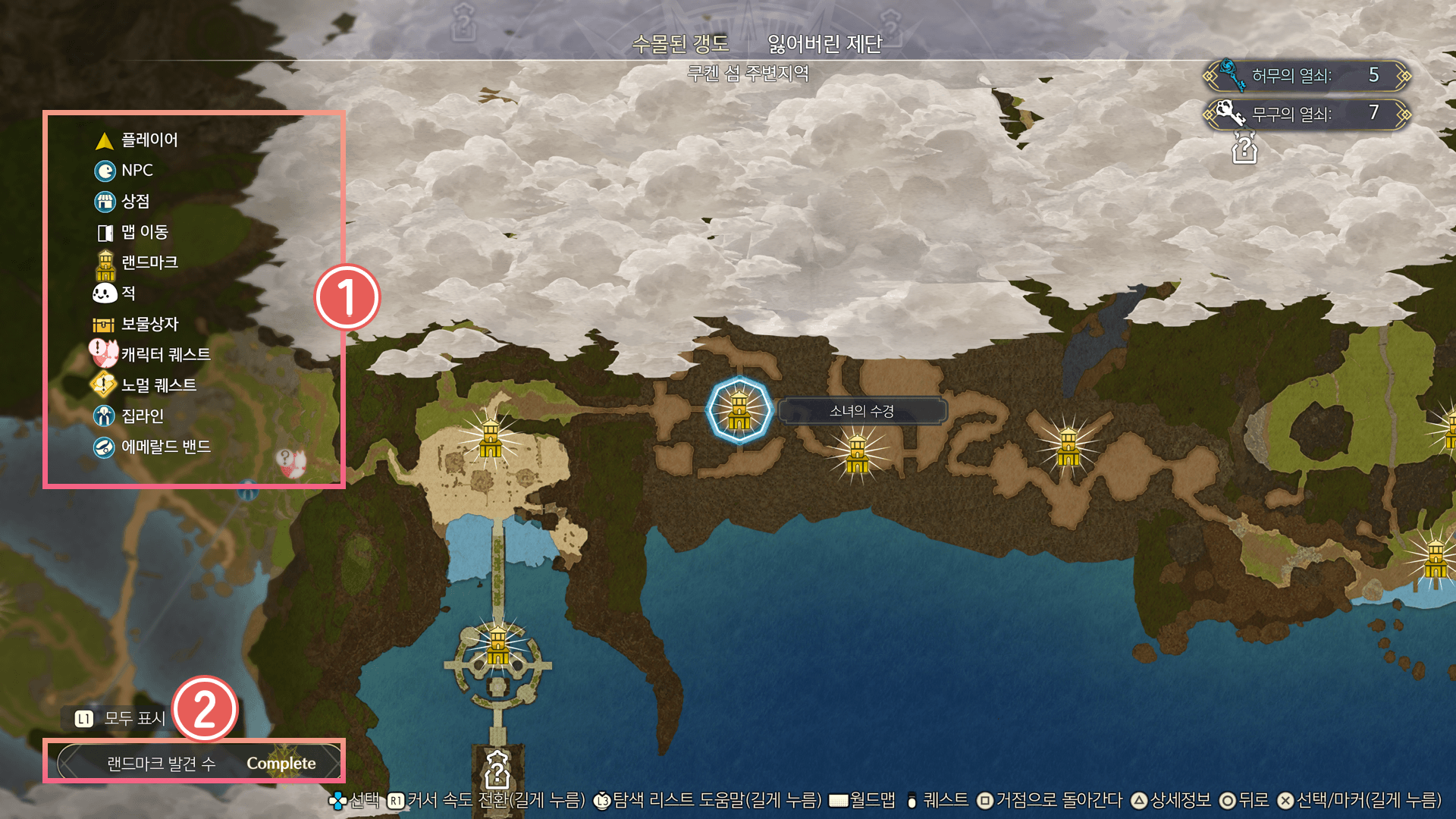 발견한 랜드마크의 수, 연 보물상자의 수가 표시됩니다.