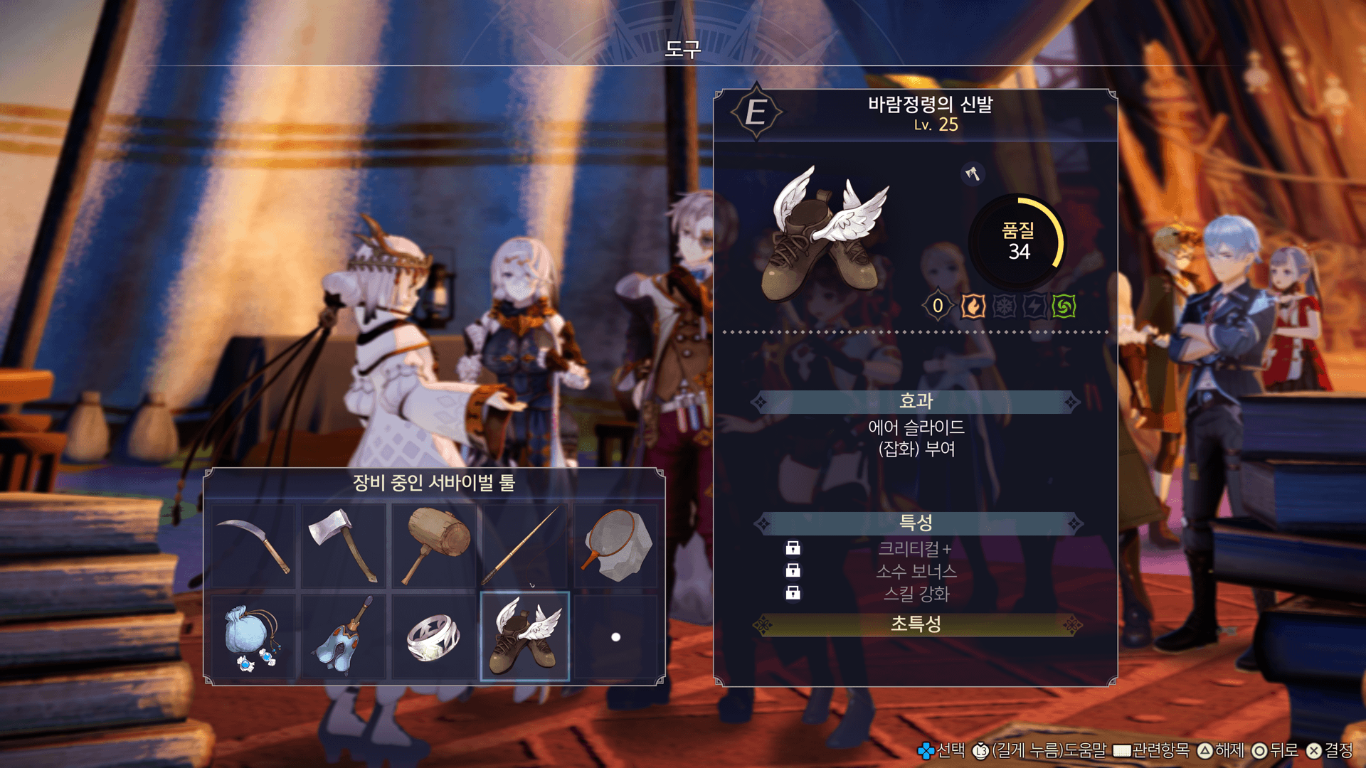 바람정령의 신발을 장비하고 있을 때 점프하고, 아래의 버튼을 길게 누르면 에어 슬라이드를 할 수 있습니다.