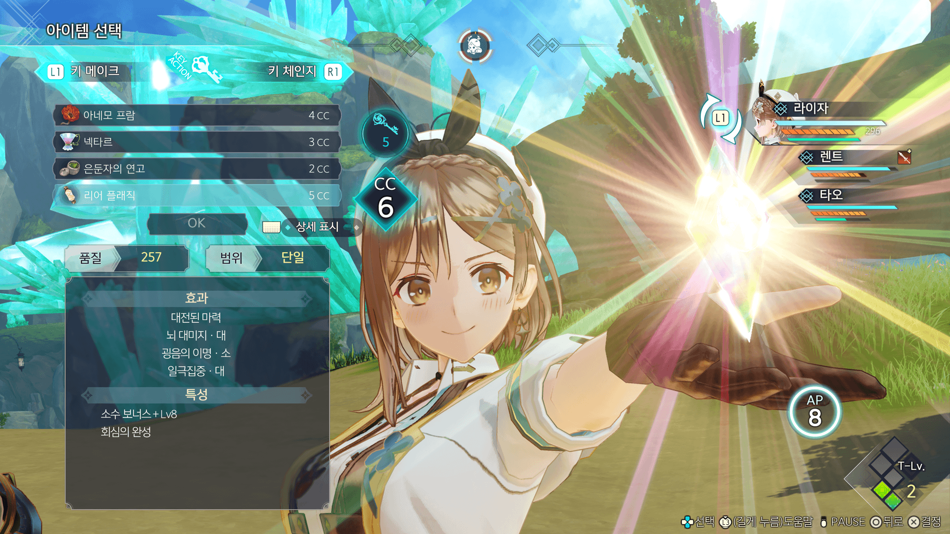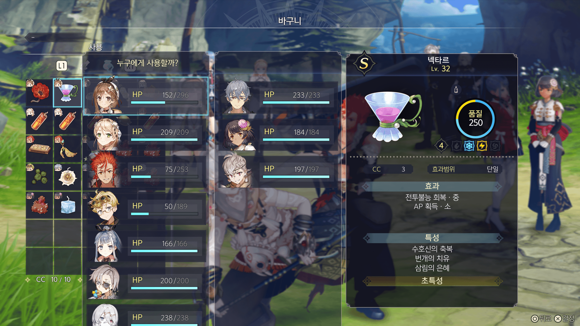 CC보틀 내의 CC를 소비하여 필드에서 회복아이템을 사용할 수 있습니다.