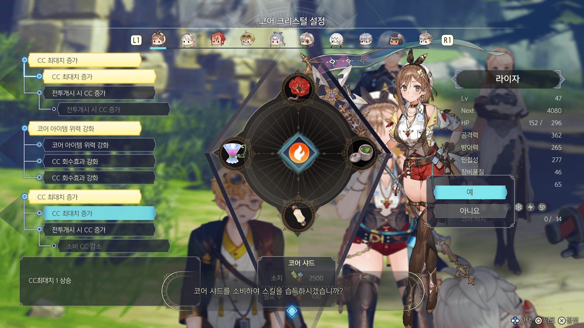 코어 크리스털을 강화하면 CC의 최대치가 증가하는 등, 코어 아이템을 쉽게 사용할 수 있게 되는 효과를 얻을 수 있습니다. 코어 크리스털을 강화하려면 코어 샤드가 필요합니다. 코어 샤드는 전투에서 획득할 수 있으며, 전투 중에 소비한 CC의 양에 따라 획득량이 증가합니다.