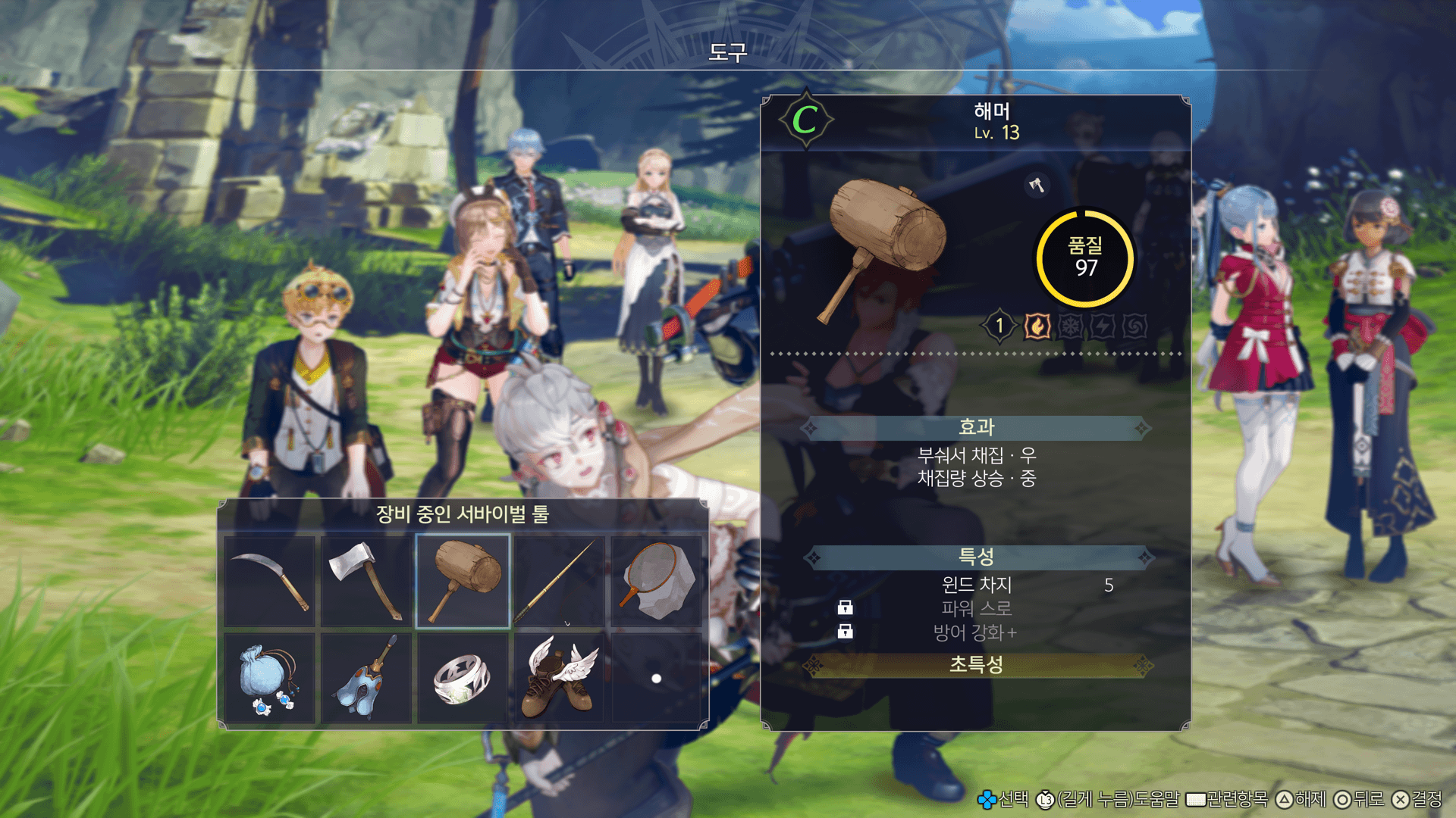 제작한 채집도구와 모험도구는 메인메뉴의 「도구」에서 장비하면, 필드에서 사용할 수 있게 됩니다.