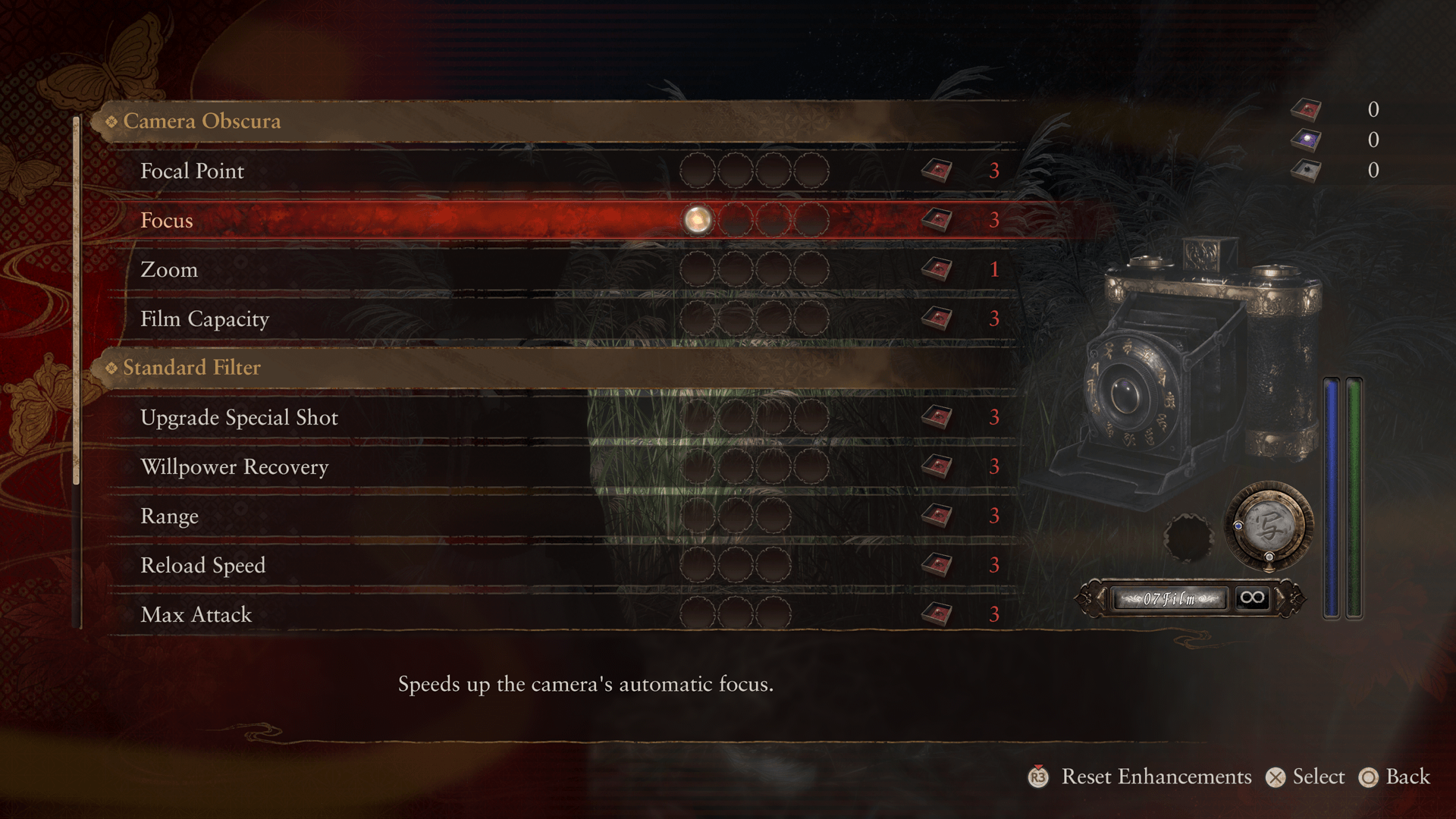 | Focus | Allows you to adjust the focus manually. You can focus faster than with auto-focus and thus deal damage more easily. Prayer Beads needed: 1 (first time) |