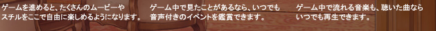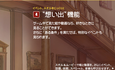 ”想い出”機能:スチル&ムービー画面 ”想い出”機能:イベント画面 ”想い出”機能:音楽画面