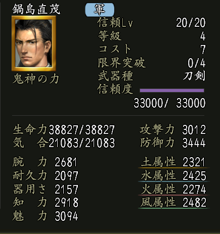 生命上昇Lv.3 | 家臣闘練で修練内容に配置された時に、生命力の上昇量を上げる。 | ||||||