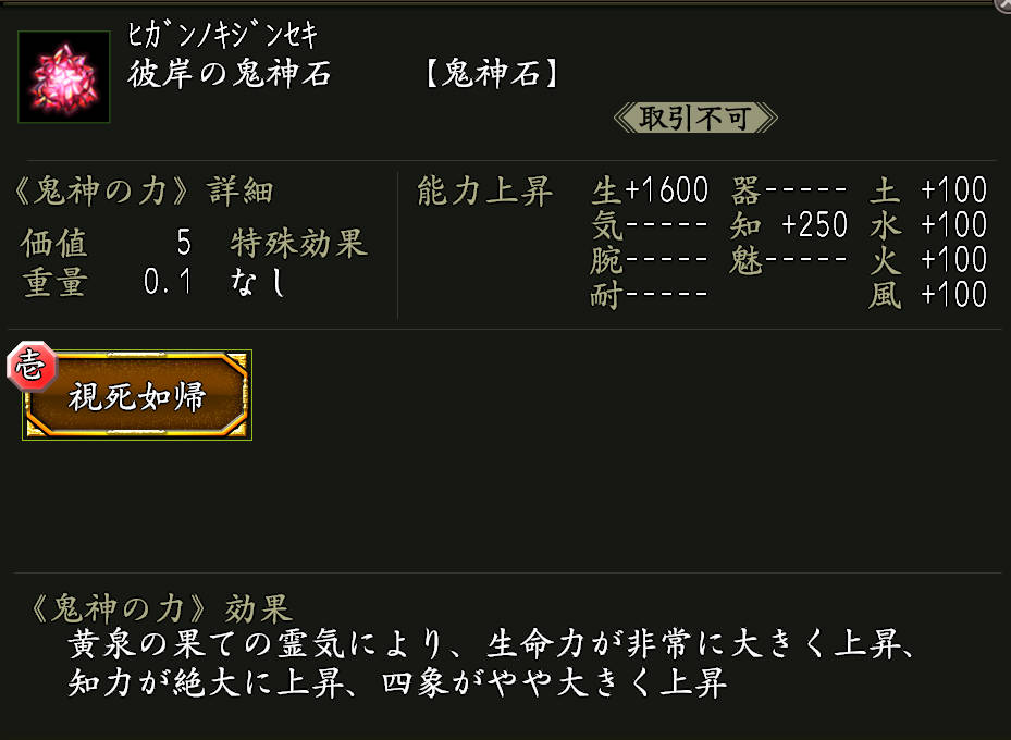 鬼神の力「視死如帰(ししにょき)」(黄金枠)が付いた鬼神石。