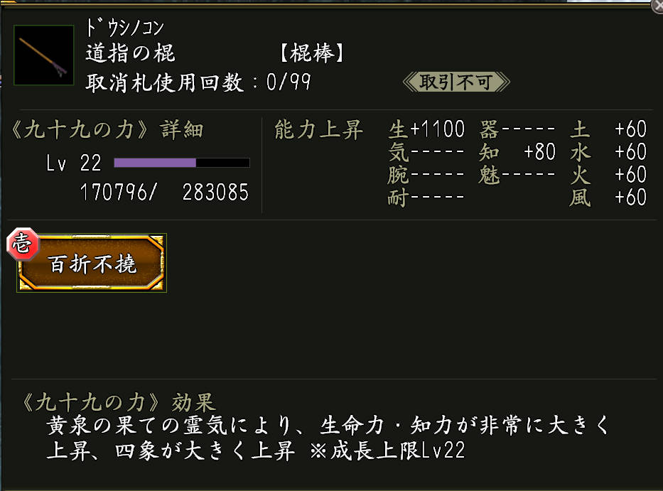 九十九の力「百折不撓(ひゃくせつふとう)」(黄金枠)がついた武器。