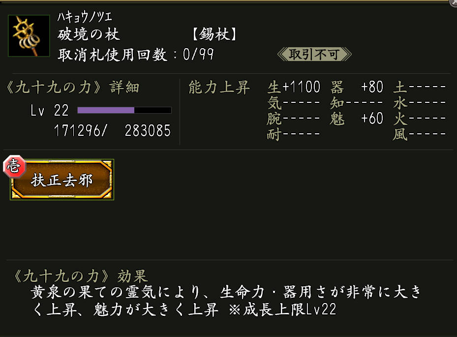 九十九の力「扶正去邪(ふせいきょじゃ)」(黄金枠)がついた武器。